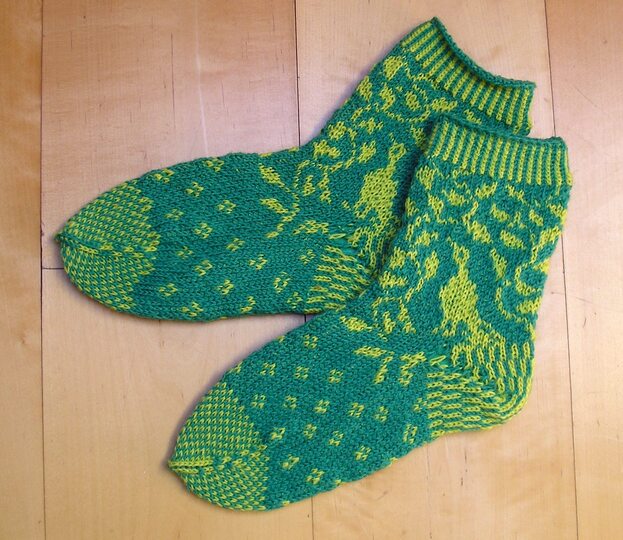 Anleitung zum Stricken der Socken "Pfauengarten" für 4-fädiger Sockenwolle zweifädig in Fair-Isles-Technick zu stricken.