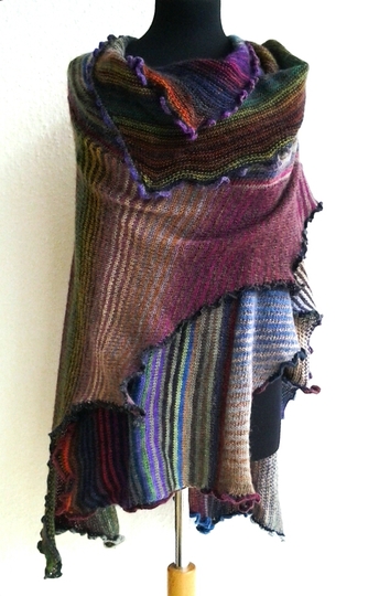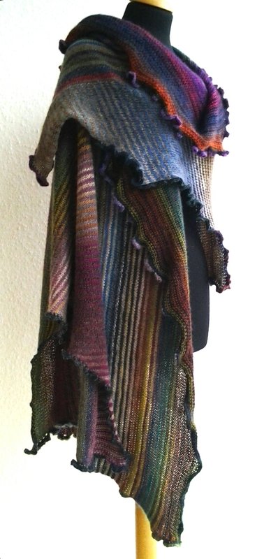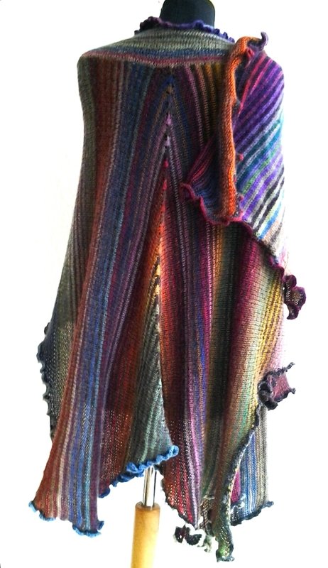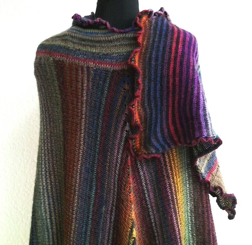 Einfach übergeworfen fällt es fließend in einer A-Linie und lässt sich auf viele Arten schwungvoll drapieren. Hypno ist eine Komposition aus schmalen Linien, wechselnden Farbverläufen, zipfeligen Außenkanten und rüschigen Konturen. Und wozu? Um das Gehirn des Gegenübers zu überlisten und es von ein paar Kurven abzulenken, die unter der extravaganten Hülle verborgen bleiben. Die Anleitung ist ideal für Körpergröße 165. Darüber solltest du eine der vorgeschlagenen Verlängerungsmöglichkeiten wählen.