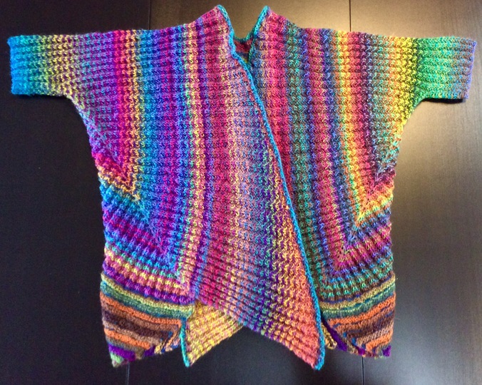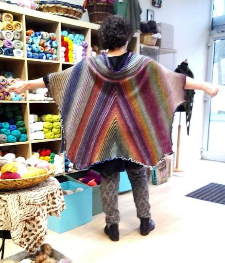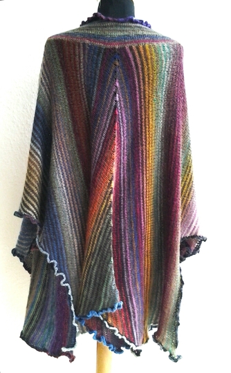Tipp: Wer sein Tuch hinten verlängern möchte, kann ein paar zusätzliche Streifen in Abschnitt 4 stricken. Eine weitere Möglichkeit, den Poncho hinten zu verlängern: in beiden Seitenflügeln Abschnitt R4 bzw. L4 an Stelle von R5 bzw. L5 stricken. Bitte denke in diesem Fall an den zusätzlichen Garnbedarf.