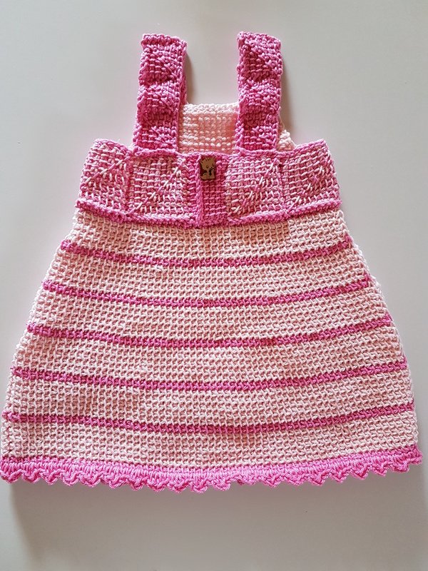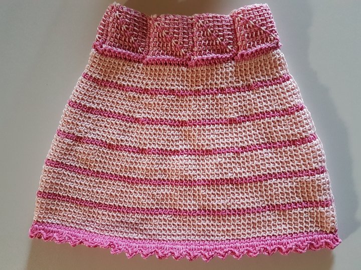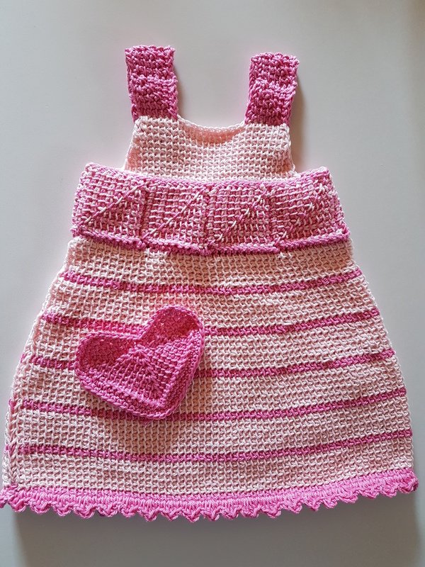 Verwendet wurde Baumwolle von Pro Lana von 125 m pro 50g, Pink und Rosa für das Kleid, Herz und