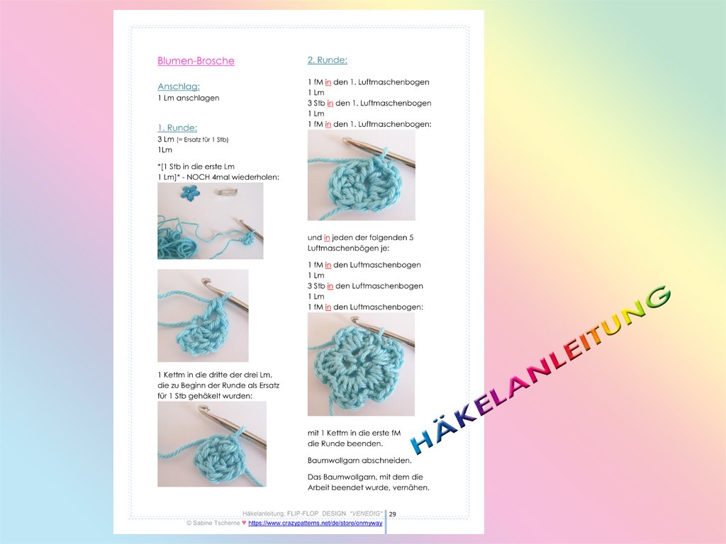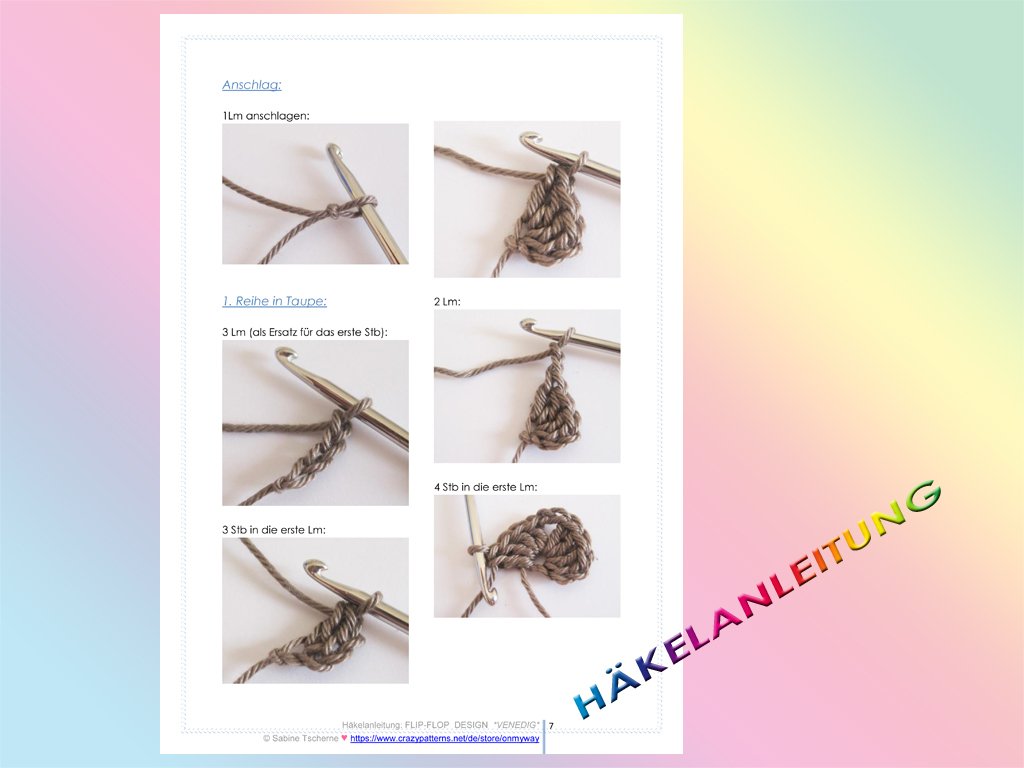 Alle Arbeitsschritte und die verwendeten Häkelmaschen werden in der Häkelanleitung sehr genau erklärt und mit vielen Abbildungen veranschaulicht. Die Anleitung umfasst 33 Seiten und ist geeignet für Flip-Flops in den Größen: 30/31, 32/33, 34/35, 36/37, 38/39, 40/41, 42/43, 44/45.