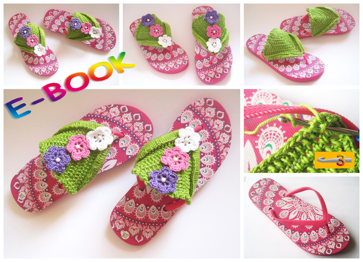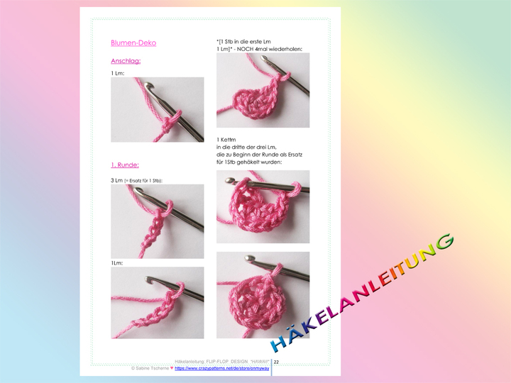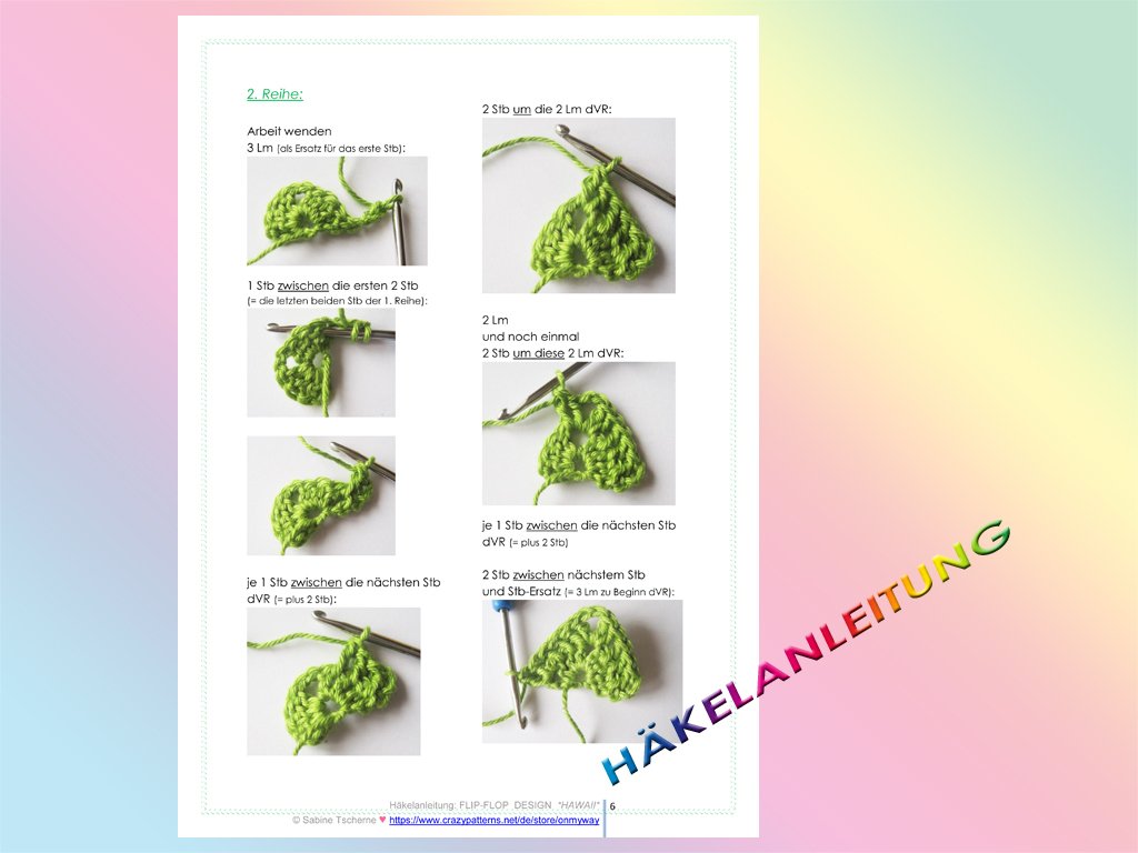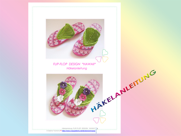 Alle Maschen werden genau erklärt. Viele Abbildungen helfen Dir bei den einzelnen Arbeitsschritten und im Nu hast Du für Deine gekauften Flip Flops einen neuen Look gehäkelt. Die Anleitung umfasst 28 Seiten.