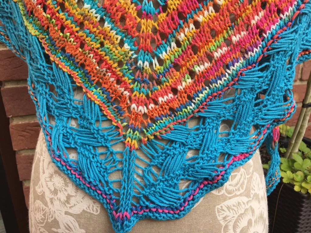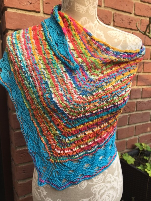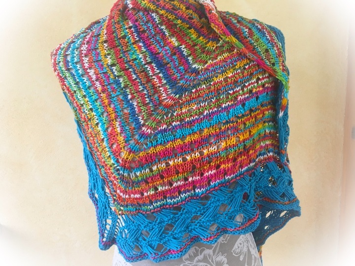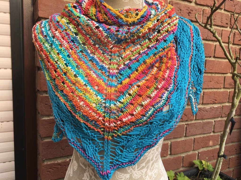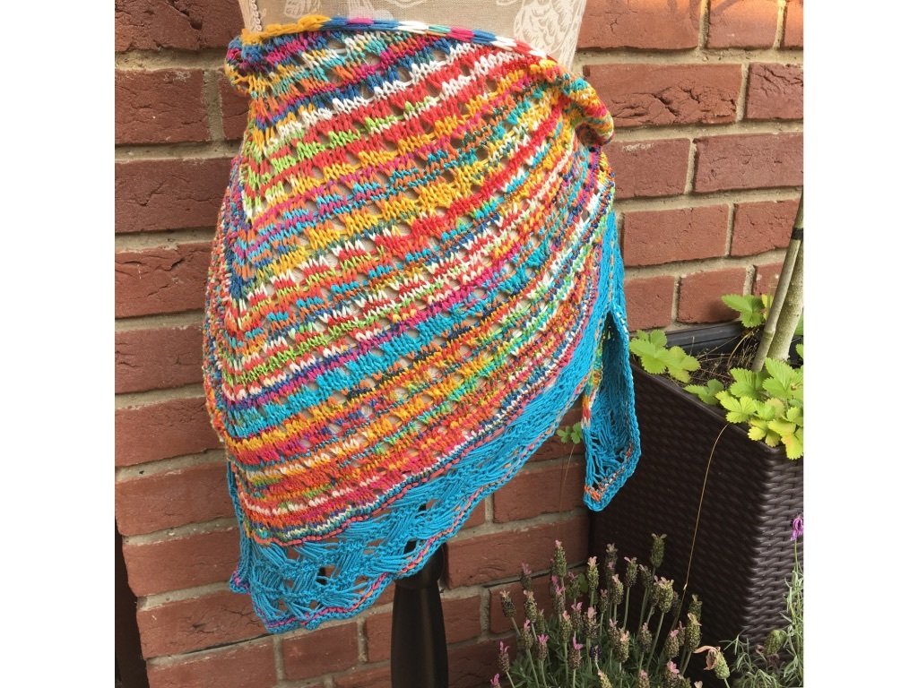 Fröhliche sommerliche Farben, gestrickt im Lochmuster, als Abschluss eine sehr dekorative Bordüre