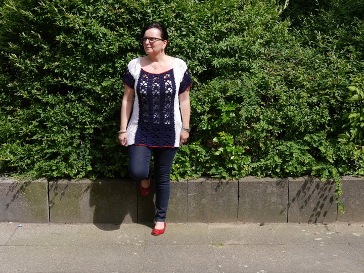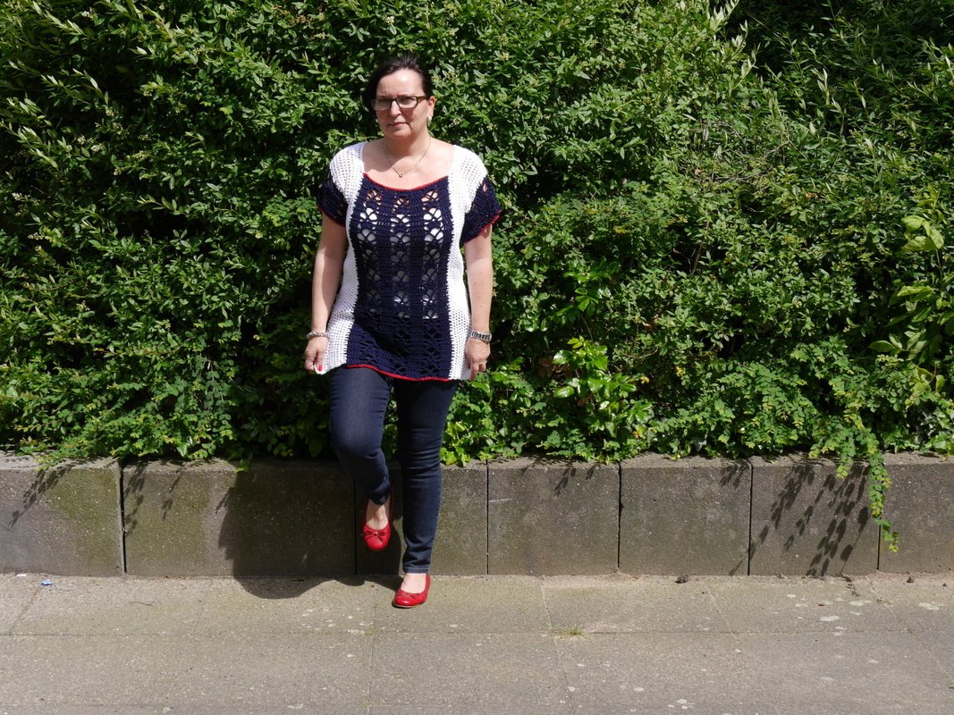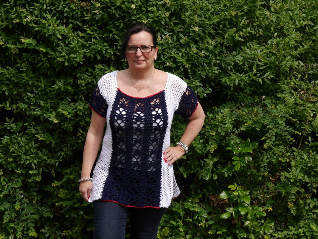 Ein maritimes Shirt/Tunika das unbedingt noch mit in den Urlaubskoffer muß.Bei diesem Shirt gibt es keinen Farbwechsel dafür wechseln wir die Häkelrichtung.Die Tunika lässt sich flott häkeln und macht durch die unterschiedlichen Häkelrichtungen richtig Spaß.