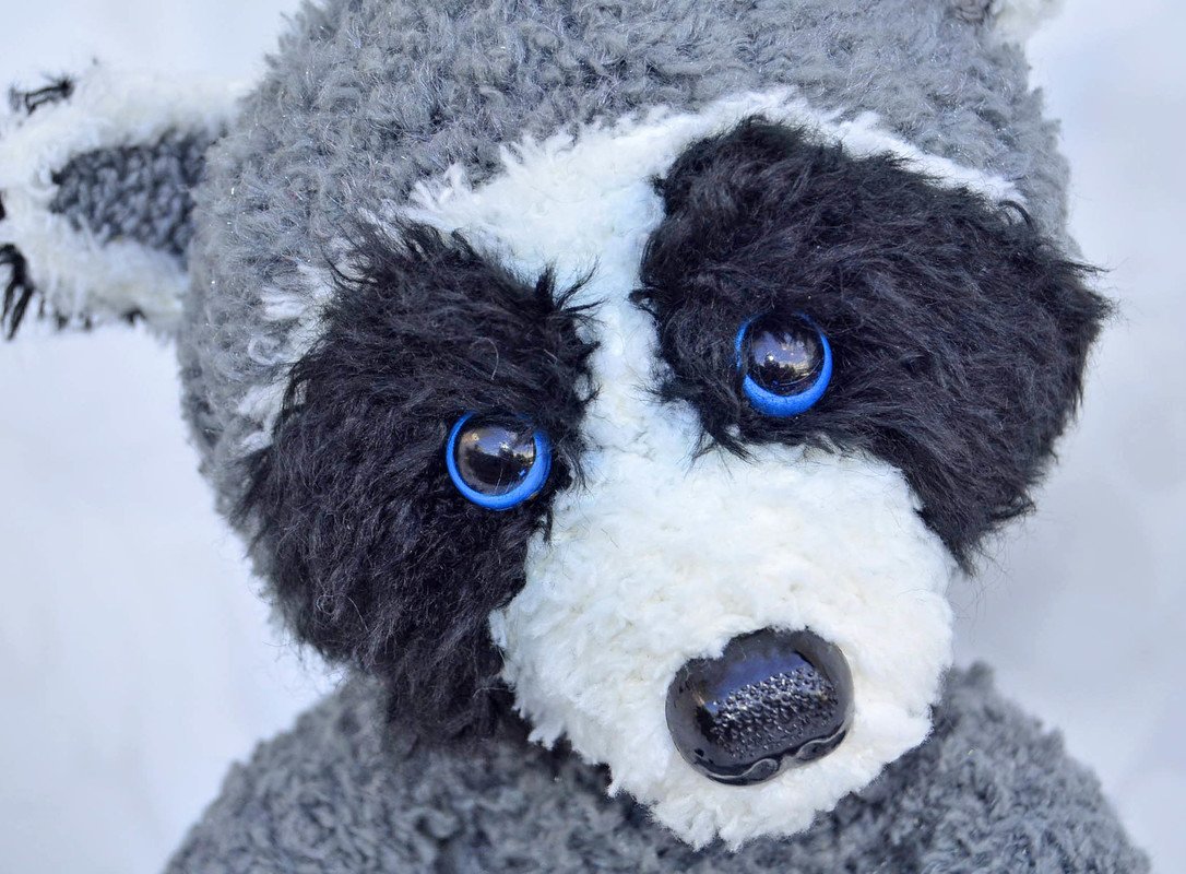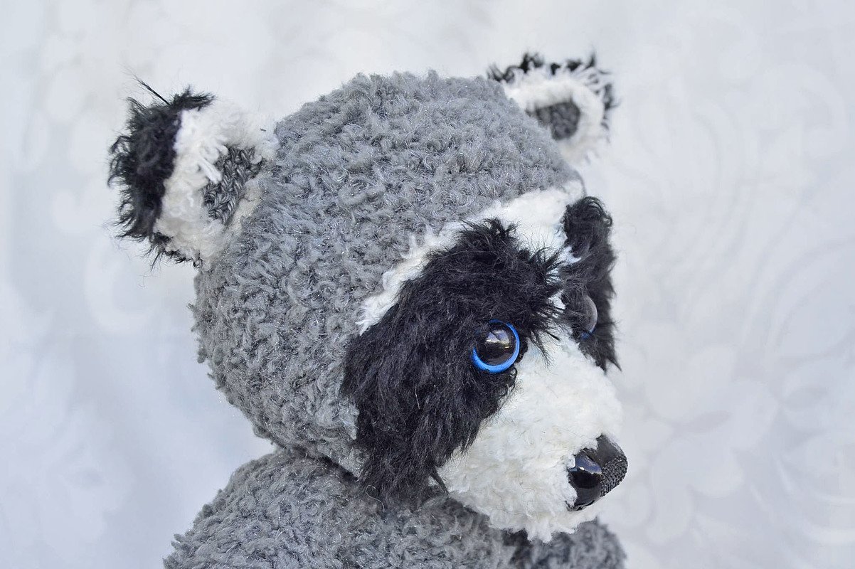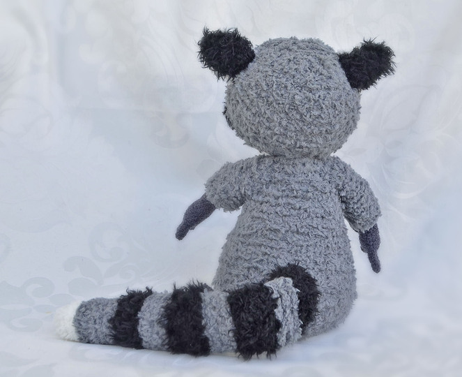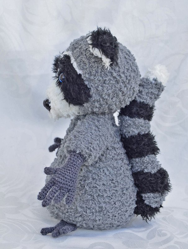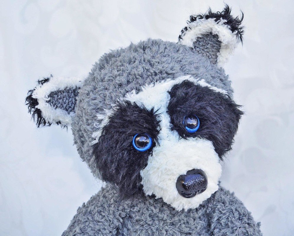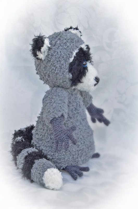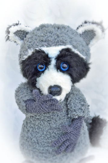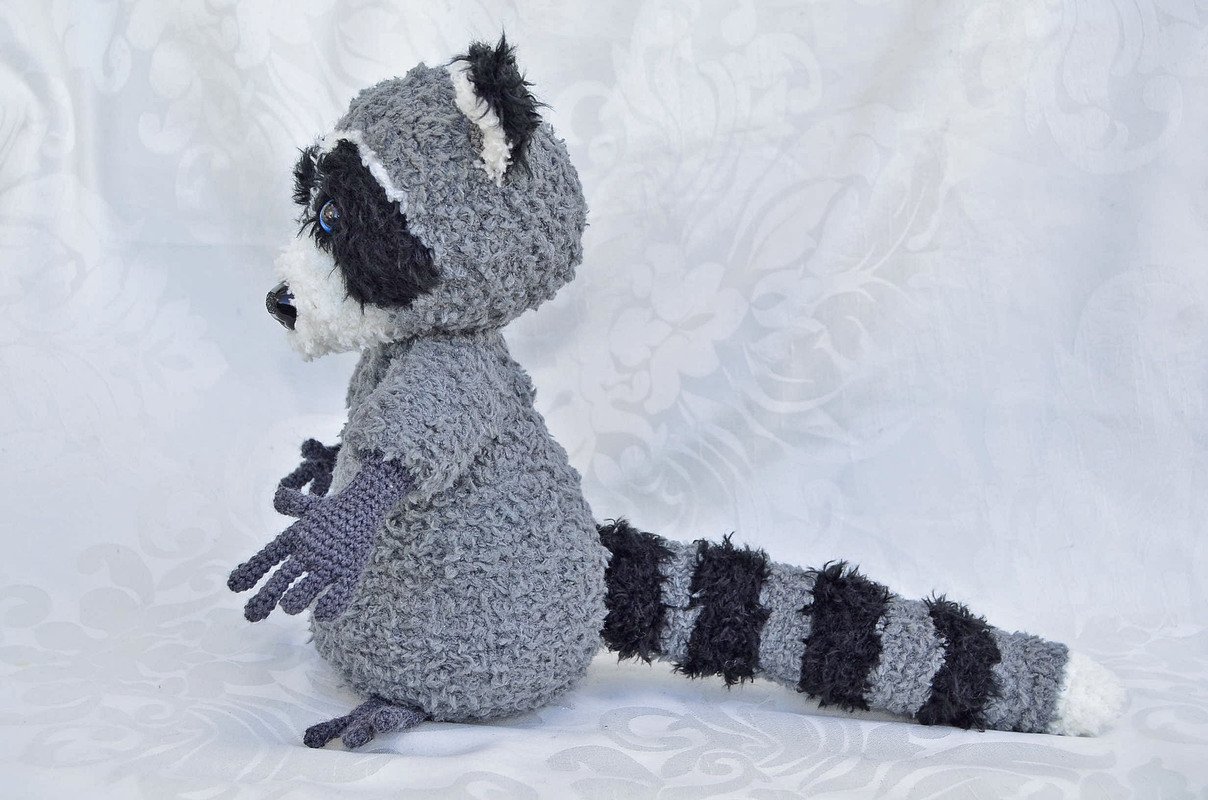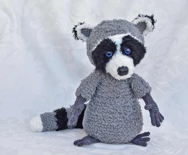 Der Waschbär ist mit Catania Originals in grau, Fransenwolle Rico fashion fur in schwarz sowie Kuschelwolle Rico Teddy aran in grau und Schachenmayr Lenja soft in weiß gearbeitet.