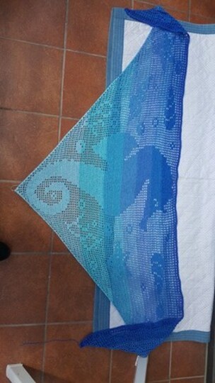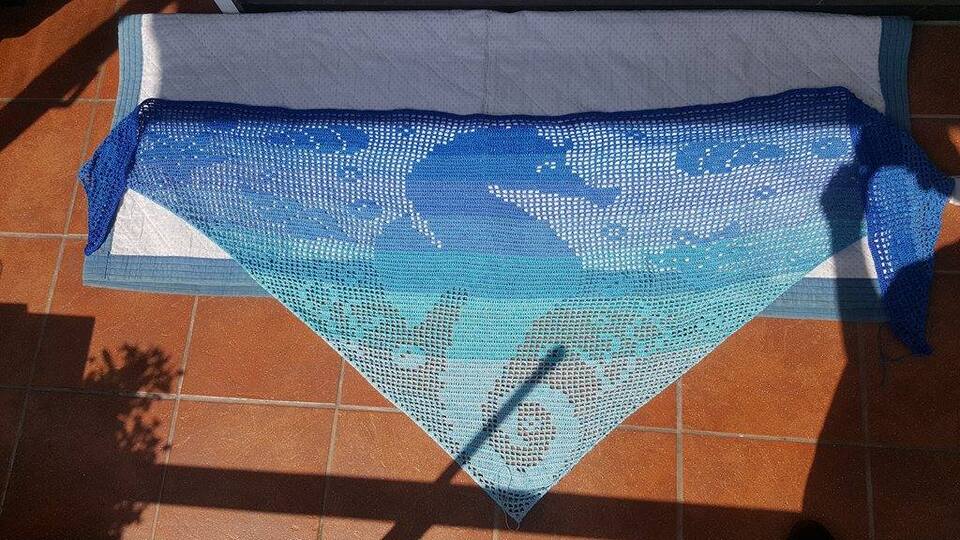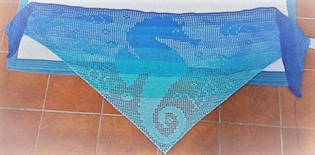 Das Tuch wurde mit ca. 1200 Metern 3- fach gefachtes Farbverlaufsgarn mit einer Nadelstärke 3 gehäkelt. Das Tuch ist ca. 238 cm lang und ca. 88 cm breit.