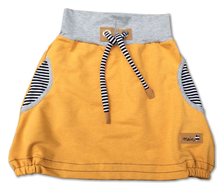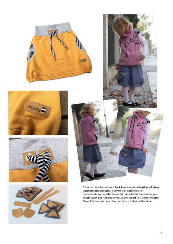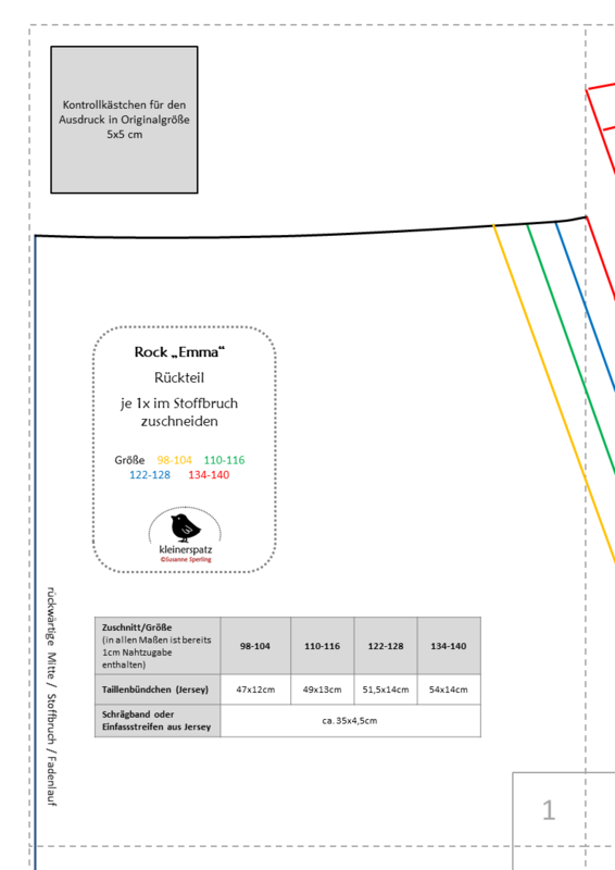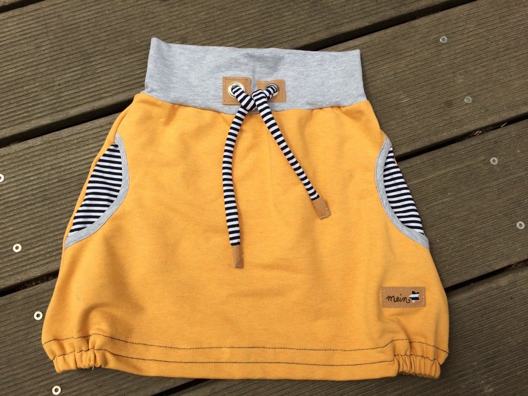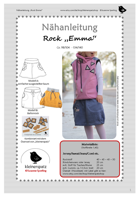 Es gibt wieder etwas Neues bei "kleinerspatz": Das Schnittmusterzeigt euch den Rock "Emma". Ein rundum bequemer und lässiger Rock aus Sweat (oder anderen Stoffen) mit einem Jerseybündchen, seitlichen Taschen und einem (optionalen) Gummizug am Saum. Er reicht bis ans Knie und macht einfach jede Bewegung mit. Toll wirkt er, wenn ihr die Taschen farblich absetzt, so wie hier aus dem schwarz-weiß geringeltem Jersey und einer Einfassung aus grauem Jersey.