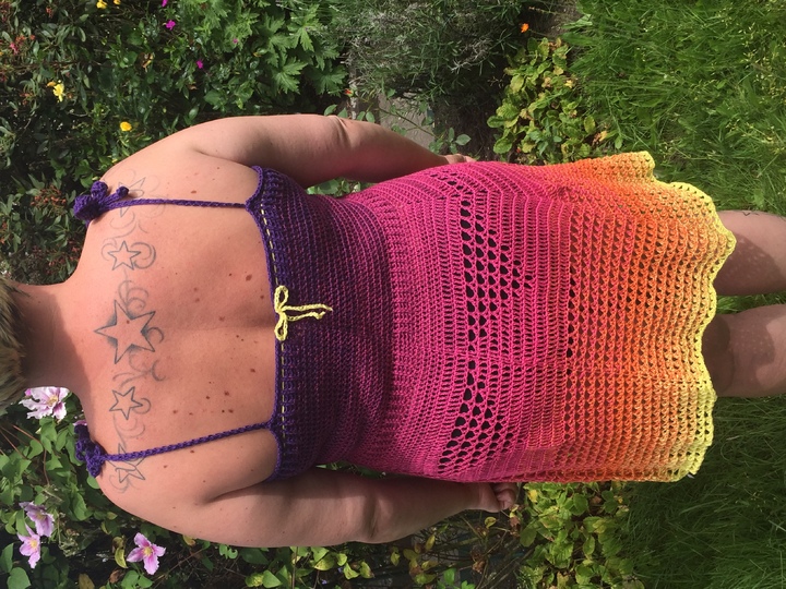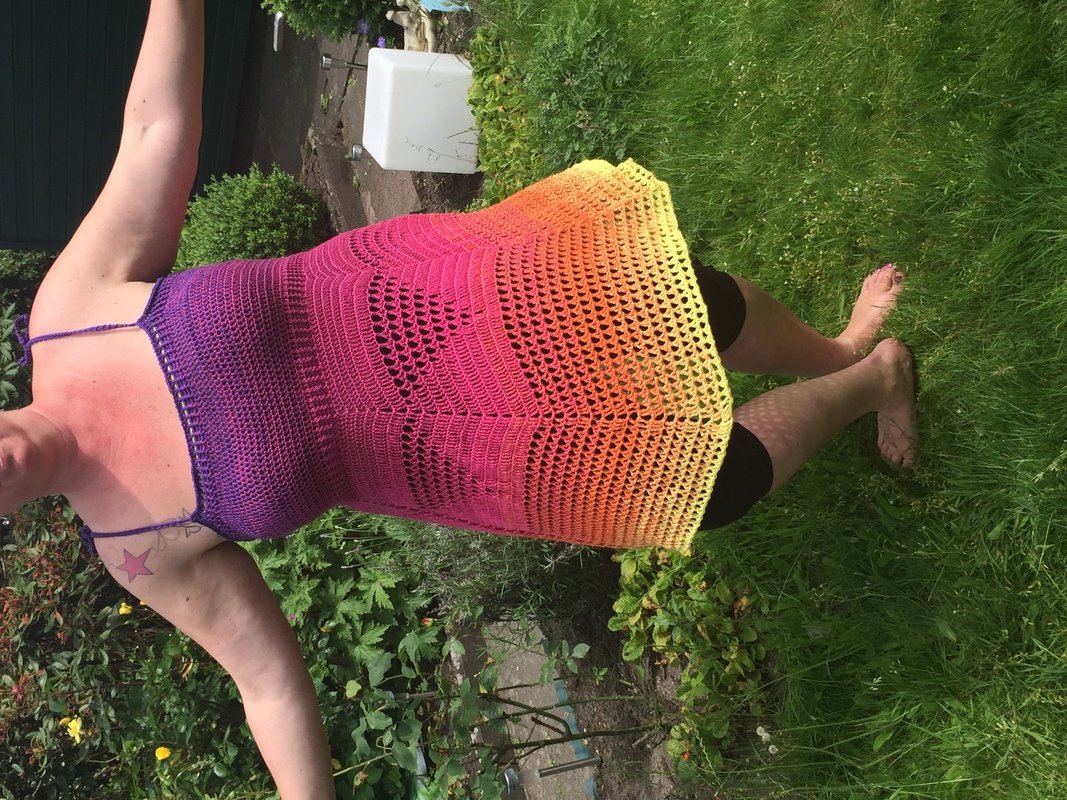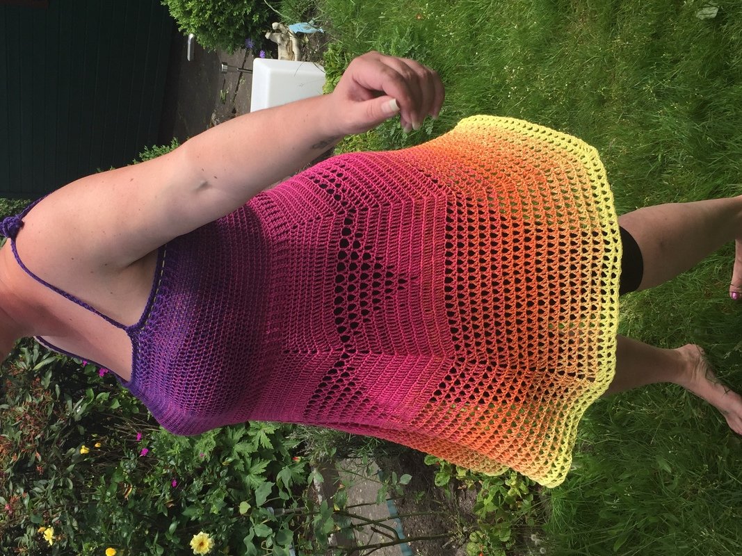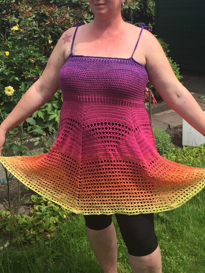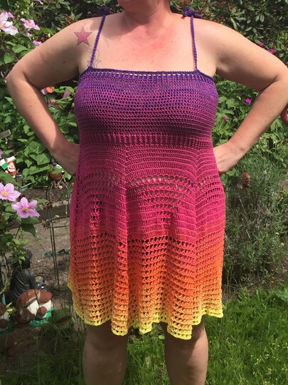 Ihr benötigt für dieses Kleid/Top einen Bobbel von 1300m. Ich habe eine 4fädige Wicklung benutzt und ihn mit einer 4,5er Nadel gehäkelt.