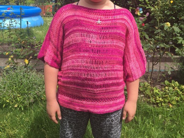 Der Pulli wird mit Stäbchen Luftmaschen (Lft), Stäbchen (Stb), Doppelstäbchen (DStb) und Dreifach-Stäbchen (3fStb) gehäkelt. Die Aufnahme erfolgt über den Fußschlingenanschlag.