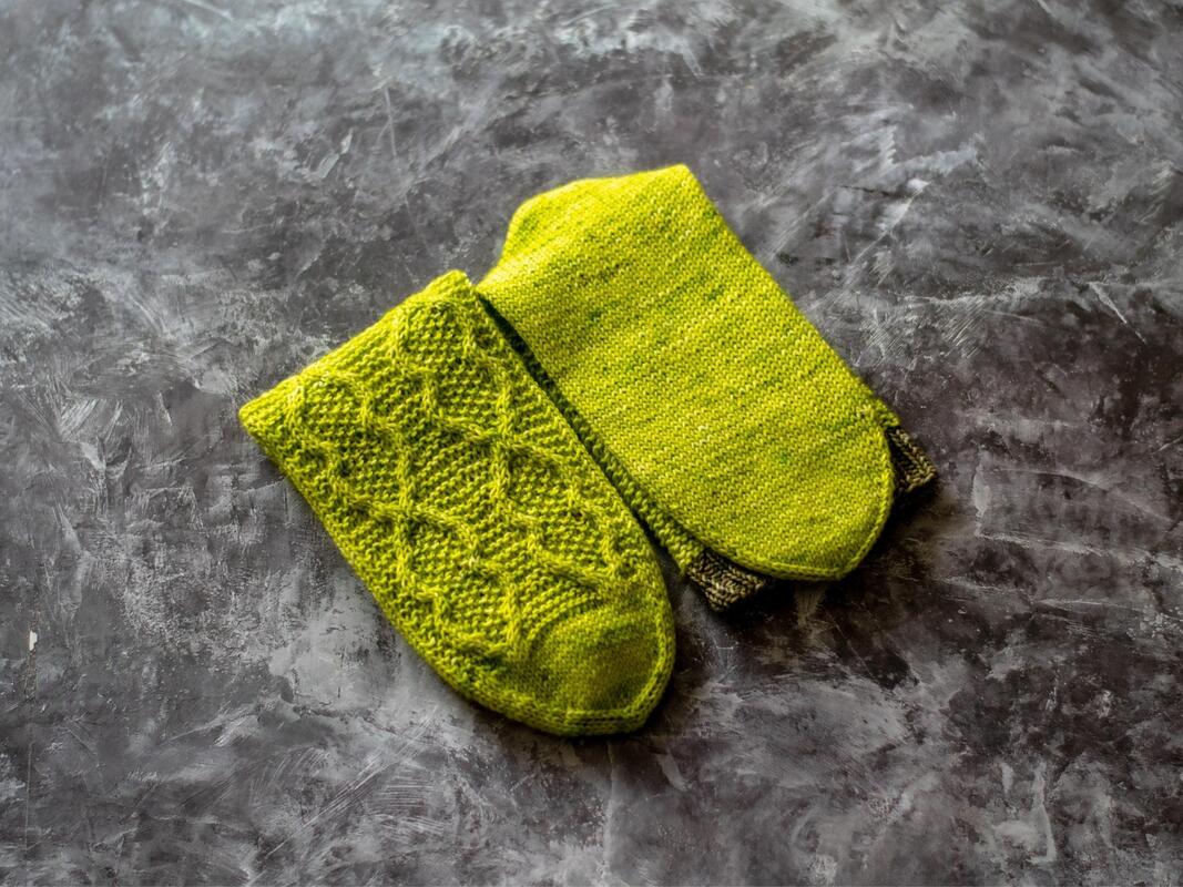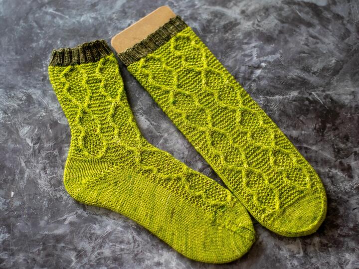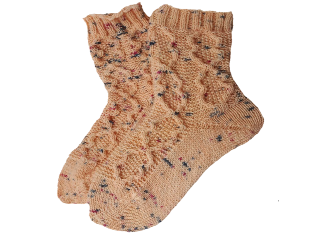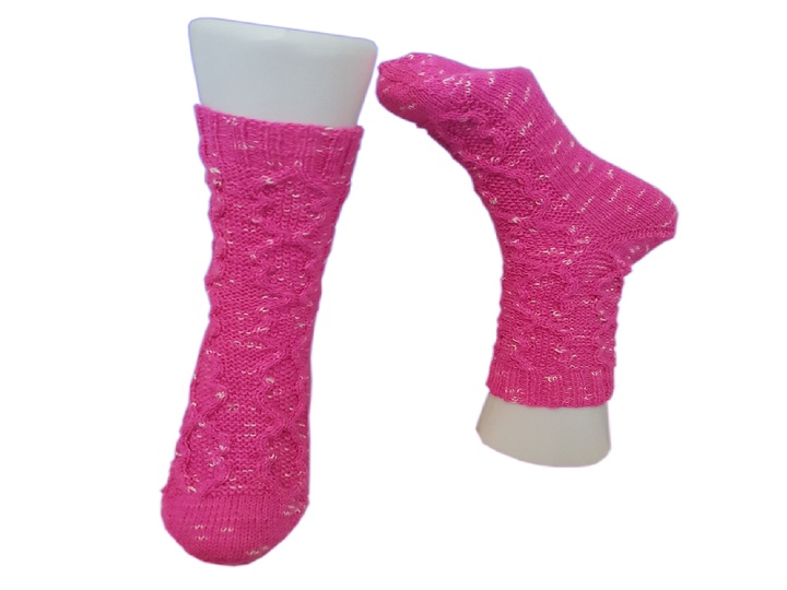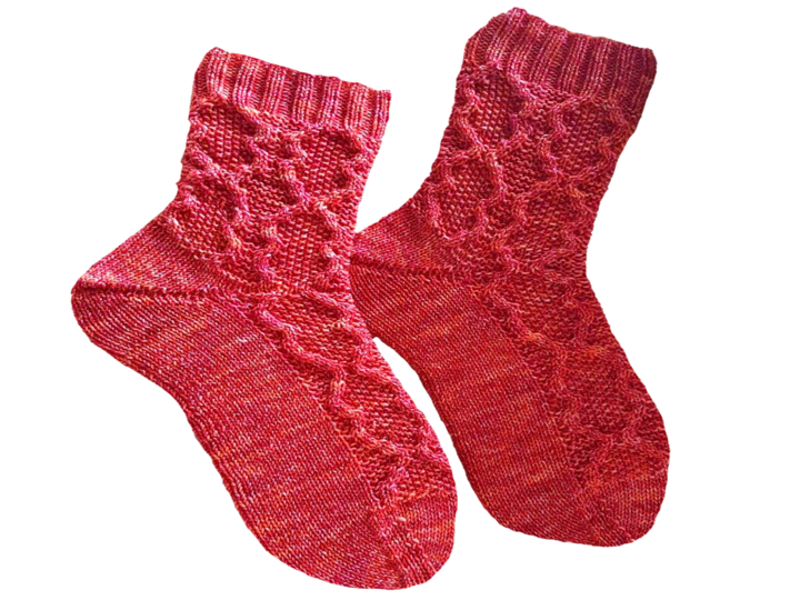 Die Socken werden in Runden gestrickt. Die Anleitung umfasst detaillierte Erläuterungen zum Muster, und eine separate Anleitung für Ferse und Spitze.