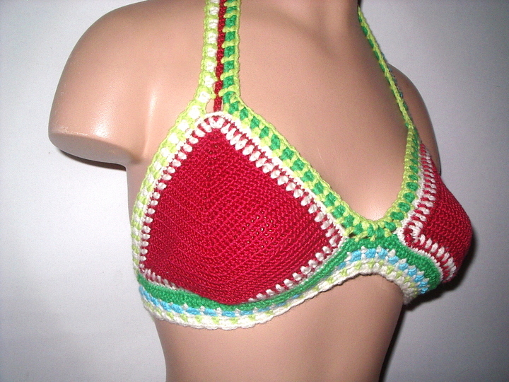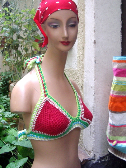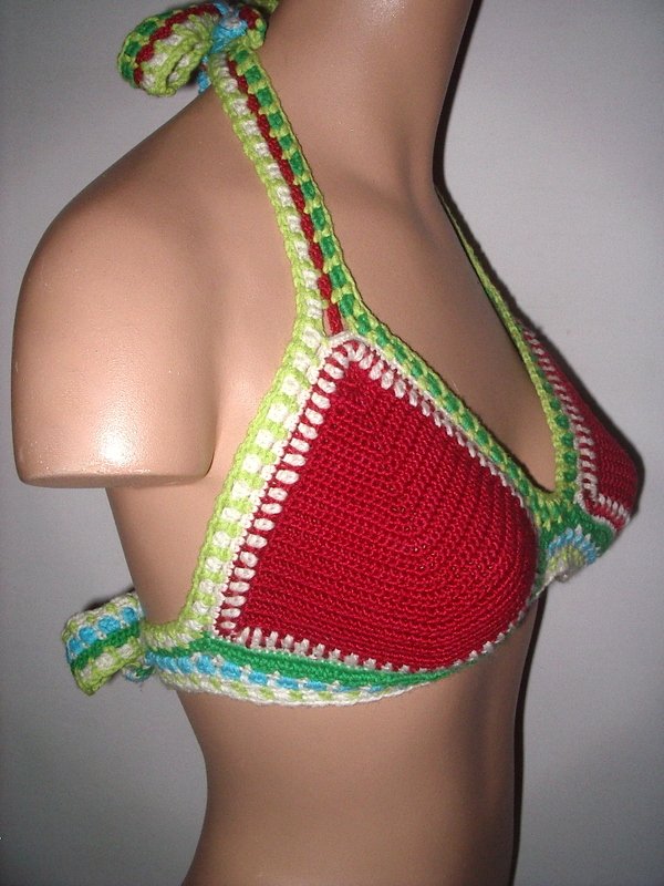 Dieser Bikini aus reiner Baumwolle ist eher zum Sonnenbaden geeignet, soll er auch für Wasserratten sein, empfiehlt es sich, eine Synthetikwolle oder ein Baumwollgarn mit Synthetikanteil zu nehmen.