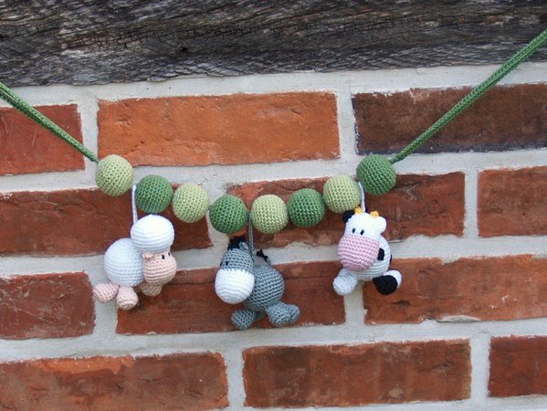 Diese niedliche Kinderwagenkette ist ein Hingucker für jeden Kinderwagen. Mit Esel, Kuh und Schaf lässt sich auch toll spielen.
