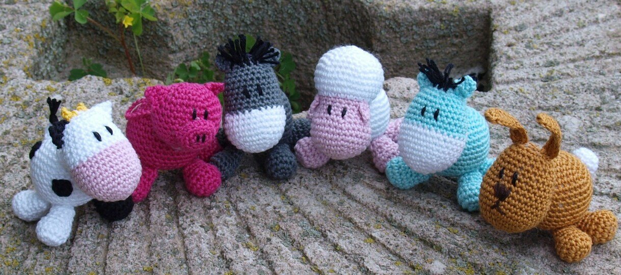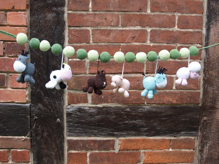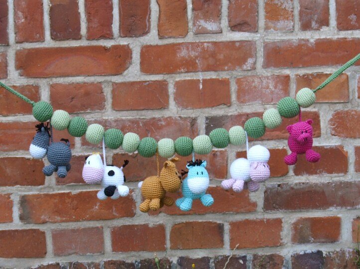 Mit dieser Anleitung kannst du eine normale Kinderwagenkette und eine große Kinderwagenkette für Zwillinge häkeln, und die Bauernhoftier.