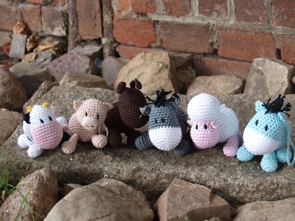 Beide sind ein Hingucker für jeden Kinderwagen und mit Esel, Schaf, Kuh, Schwein und Hase läßt sich toll spielen.