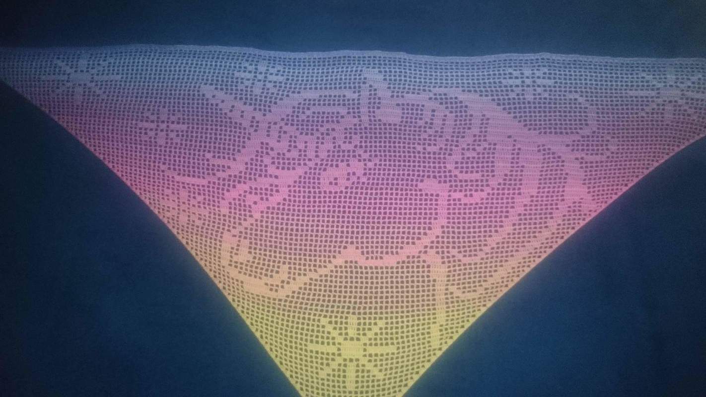 Gehäkelt wird von unten nach oben. Benötigt werden Grundkenntnisse beim Häkeln von Luftmaschen, Stäbchen und Doppelstäbchen. Das Motivtuch wurde mit einem dreifädigen Farbverlaufsgarn gehäkelt. Verwendet wurden ca. 900 Meter. Damit hat das Tuch eine Größe von etwa 197x85 cm.