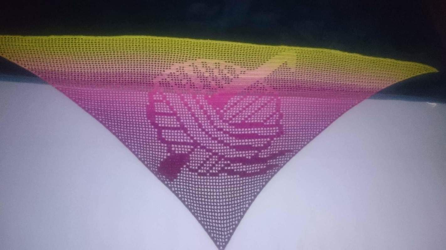 Gehäkelt wird von unten nach oben. Benötigt werden Grundkenntnisse beim Häkeln von Luftmaschen, Stäbchen und Doppelstäbchen. Das Motivtuch wurde mit einem dreifädigen Farbverlaufsgarn gehäkelt. Verwendet wurden ca. 700 Meter. Damit hat das Tuch eine Größe von etwa 182x77 cm.