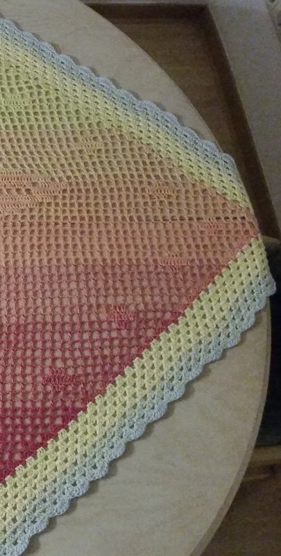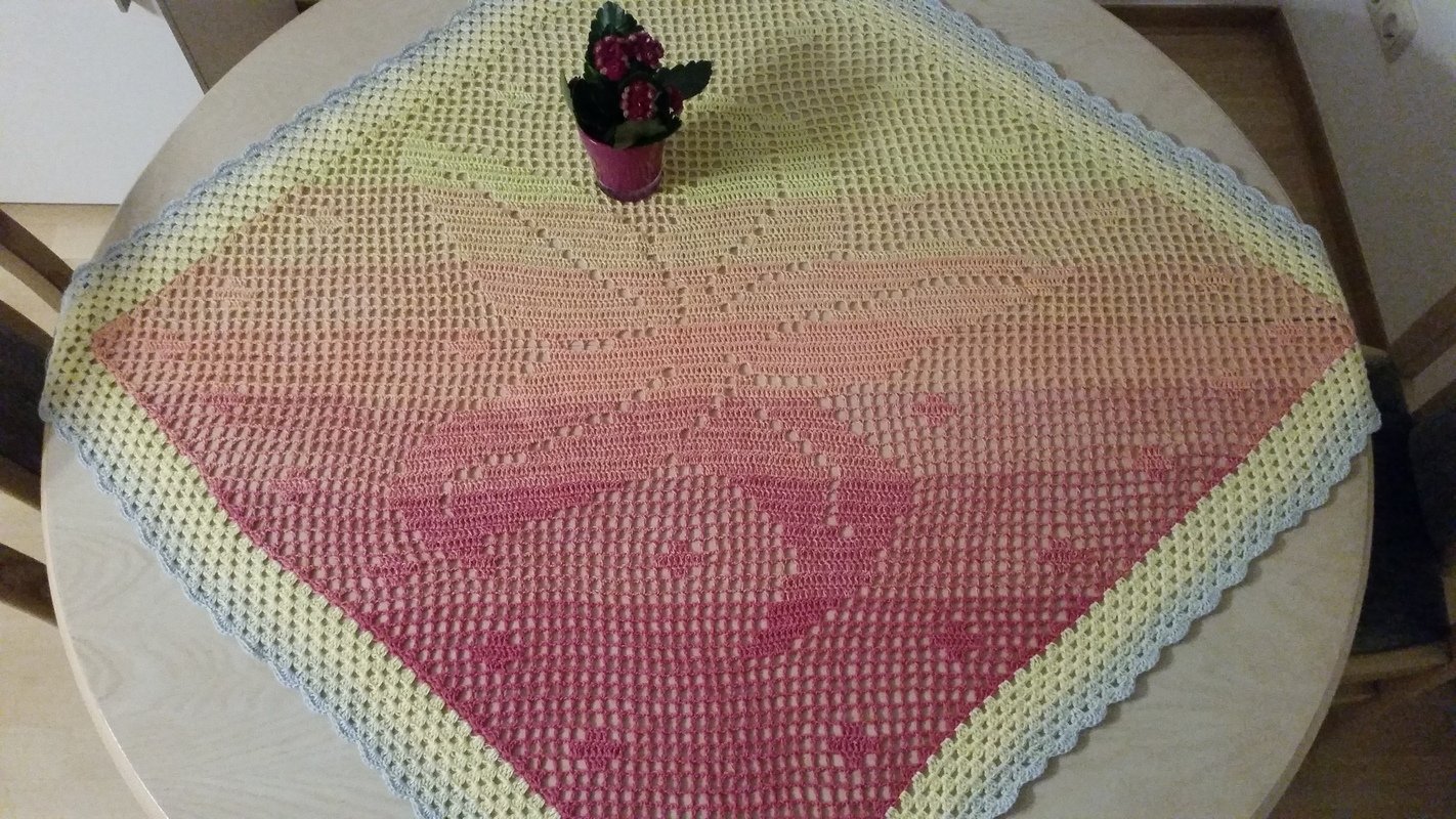 Gehäkelt wird von unten nach oben bzw von der unteren Ecke zur Oberen. Benötigt werden Grundkenntnisse beim Häkeln von Luftmaschen, Stäbchen und Doppelstäbchen. Die Tischdecke wurde mit einem dreifädigen Farbverlaufsgarn gehäkelt. Verwendet wurden ca. 1100 Meter. Damit hat die Tischdecke eine Größe von etwa 125x125 cm.