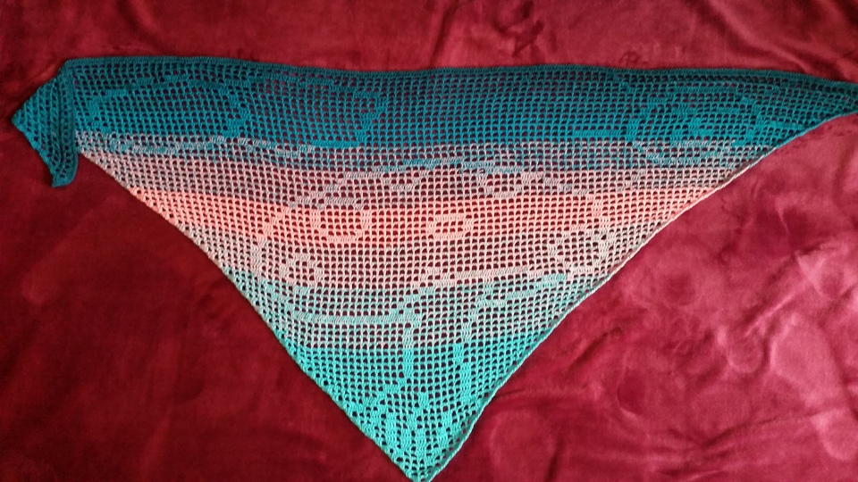 Gehäkelt wird von unten nach oben. Benötigt werden Grundkenntnisse beim Häkeln von Luftmaschen, Stäbchen und Doppelstäbchen. Das Motivtuch wurde mit einem dreifädigen Farbverlaufsgarn gehäkelt. Verwendet wurden ca. 500 Meter. Damit hat das Tuch eine Größe von etwa 150x74 cm.