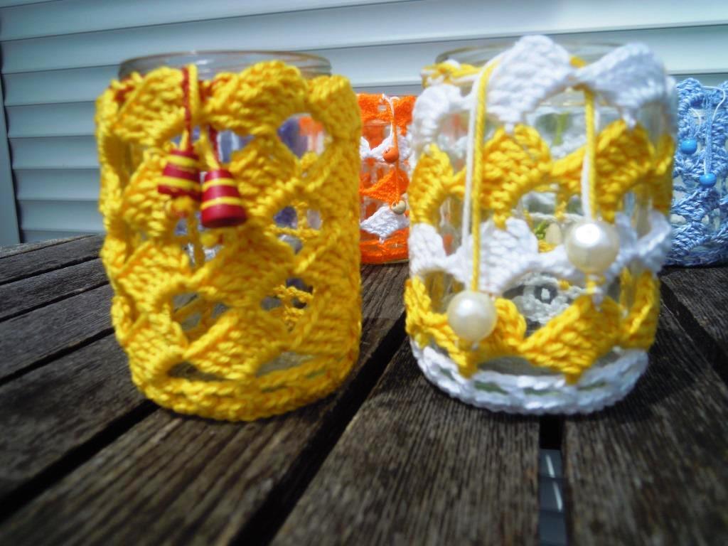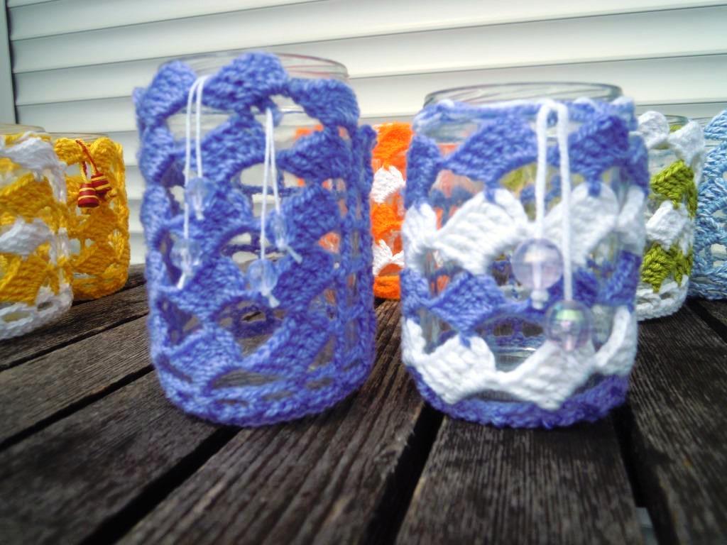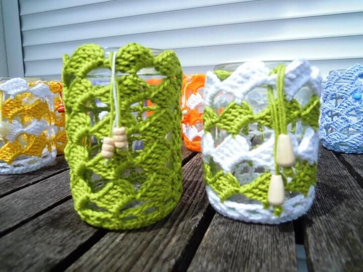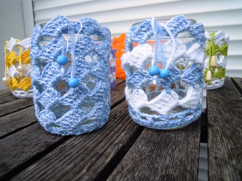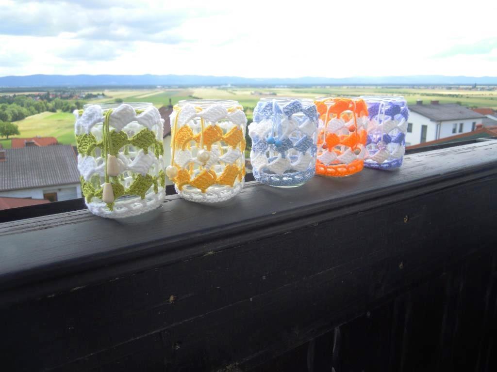 Das Beste an diesen umhäkelten Gläsern ist, dass man sie wirklich schnell machen kann und sie sich bestens zur Wollresteverwertung eignen. Mit ein wenig Übung ist ein Glas schon in 30 Minuten fertig.