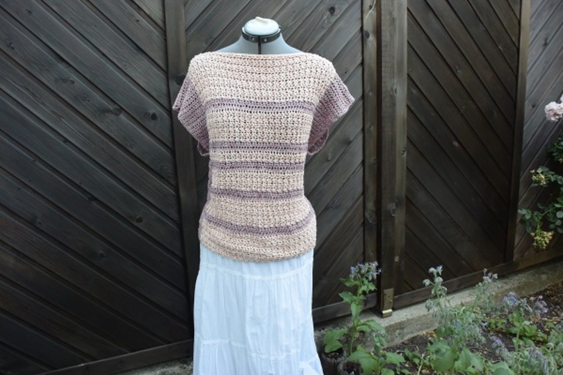 Vorder -und Rückseite werden an einem Stück gehäkelt, durch den Farbwechsel mit drei Knäule erspart man sich das zusammen nähen.