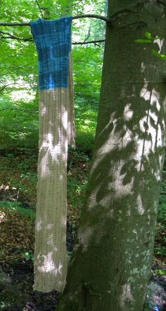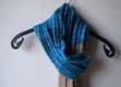 Der Schal auf den Bildern wurde aus Lana Grossa Meilenweit Tweed (beige) und Lana Grossa Meilenweit Special (blau) gestrickt, zwei sehr gebräuchliche Sockenwollen, nichts Ausgefallenes. Ähnliche Garne erhält man fast überall. Man kann auch andere Garnstärken verwenden, ich kann mir den Schal sehr gut auch in etwas dickeren Wollen vorstellen. Auch ob man eine Farbe oder zwei verwendet, richtet sich nach dem persönlichen Geschmack.
