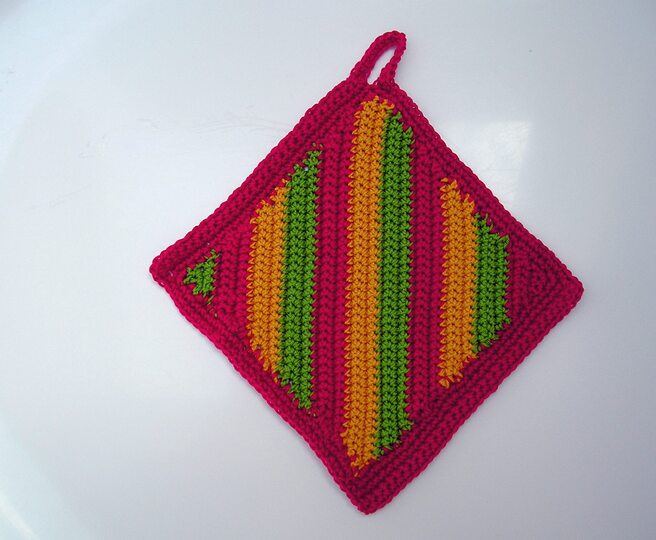 Der Motivtopflappen wird mehrfädig mit festen Maschen gehäkelt. Dabei hat man einen Arbeitsfaden und mehrere Ruhefäden. Während man mit dem Arbeitsfaden Maschen häkelt werden die Ruhefäden von den festen Maschen mit umhäkelt. Dadurch bilden die Ruhefäden auf den Rückseite keine langen Schlaufen und sind fast unsichtbar. Das ist nicht besonders schwierig und auch für Häkelanfängerinnen gut zu bewältigen. Die Anleitung enthält eine ausführliche textliche Beschreibung sowie eine Häkelschrift.