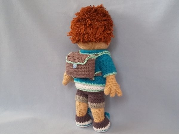 Die PDF beinhaltet die Anleitung für die Puppe, die Hose, den Pulli, die Turnschuh, die Jacke, den Ranzen, den Schlips sowie für die Brille und die Zuckertüte.