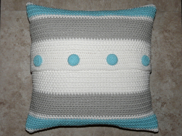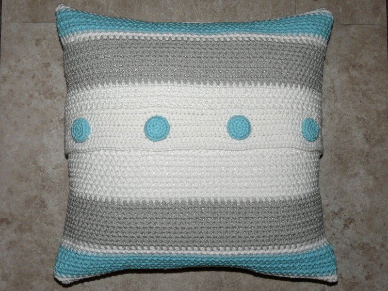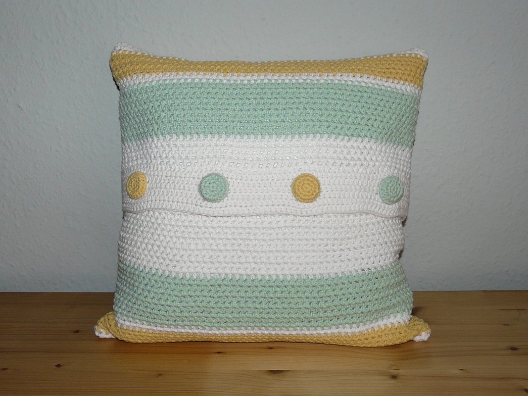 Dieses tolle Kissen ist im handumdrehen gehäkelt und sieht durch das dezente Muster sehr schön aus. Das Kissen ist ein idealer Begleiter auf der Couch oder im Bett. Die Farben könnt ihr natürlich frei nach eurem Geschmack wählen. Die kontrastreichen Streifen verleihen dem Kissen seinen ganz besonderen Charme.