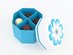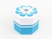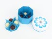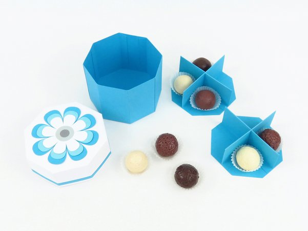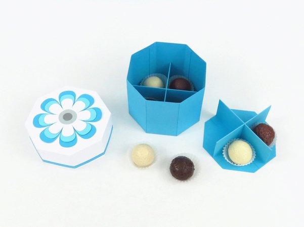 Die Schachtel ist ca. 9,5 x 7,5 x 9,5 cm groß und hat zwei Stockwerke, auf welchen jeweils vier Pralinen mit dem Durchmesser von 3 - 3,5 cm getrennt voneinander Platz finden.