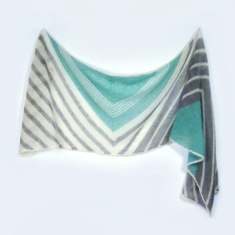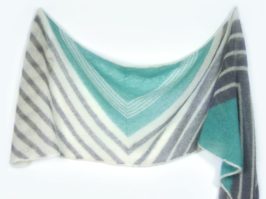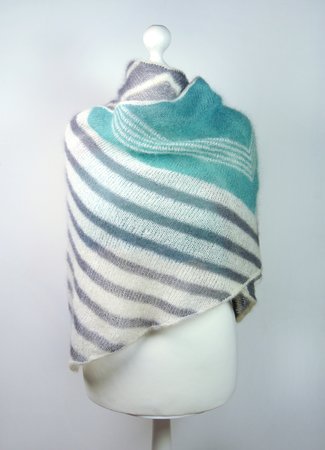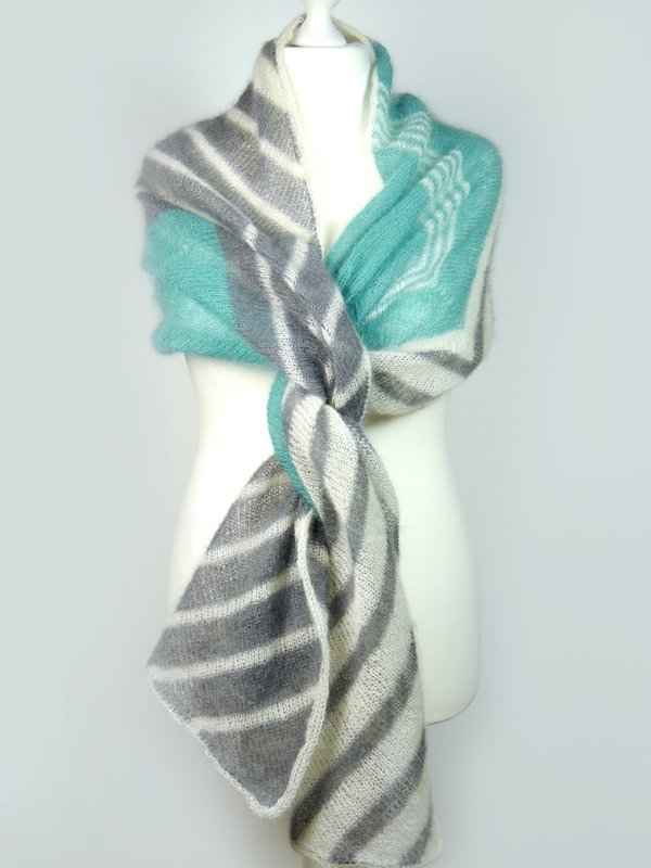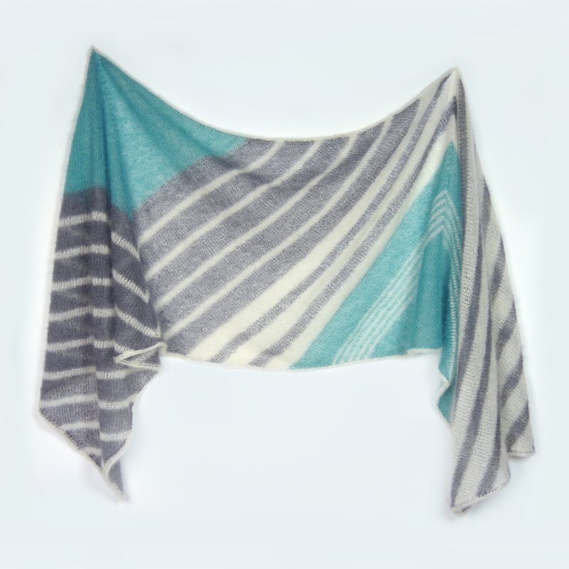 Maritime Streifen und markante Dreiecke, die an Segel erinnern, haben mich zu dem Namen WINDSEEKER inspiriert – ein Windseeker ist ein Segel, das bei einer leichten Brise zum Einsatz kommt. Und mit ihren 111 Gramm ist auch diese Stola leicht wie ein Hauch! Sie passt in jedes Reisegepäck und wird Ihnen eine willkommene Begleitern während des nächsten Urlaubs am Meer sein, denn das wunderbar weiche Mohairgarn ist kuschelig warm. Auch im Winter leistet die Stola als üppiger Schal gute Dienste. Stricken Sie die Stola doch in Ihren Ferien: Die Wolle findet überall Platz, und dank der Lauflänge sind Sie auch nicht zu schnell fertig. Übrigens, bei den Bildern gibt‘s Farbvorschläge!