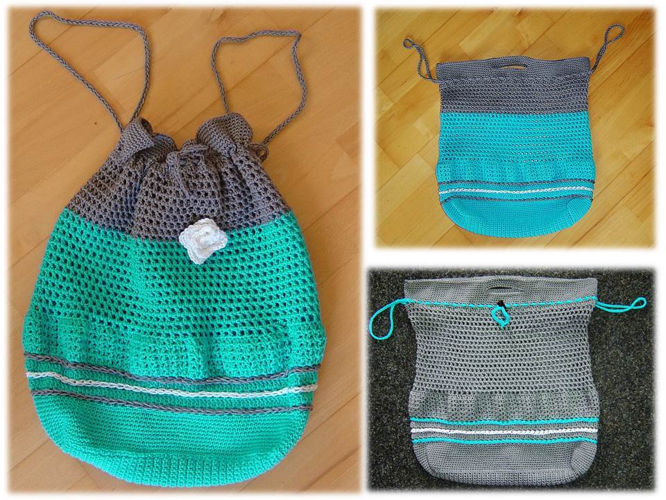 Modell 1: hier passt ein breiter Ordner rein; Modell 2 ist etwas kleiner – inkl. Häkelblume.