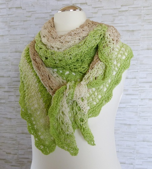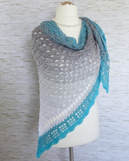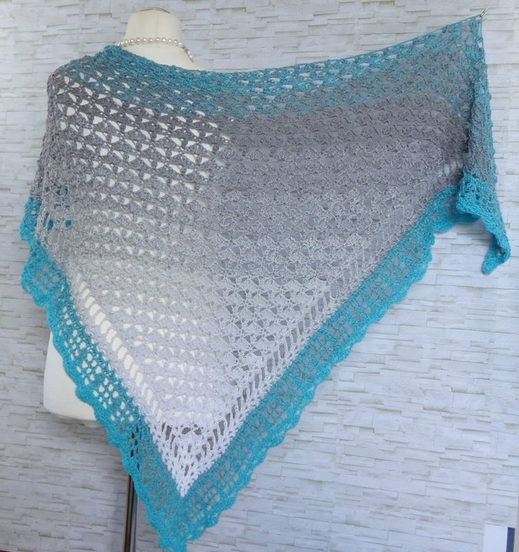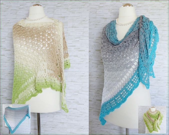 Das Dreieckstuch kann mit fasst jedem Garn (Nadelstärke 2,5 - 4) gehäkelt werden. Es eignet sich somit Farbverlaufsgarne (Bobbel), dünne Merino- oder Mikrofasergarne, Baumwoll- oder Baumwoll-Mischgarn. Für die abgebildeten Dreieckstücher sind Wollangaben in der Anleitung enthalten.