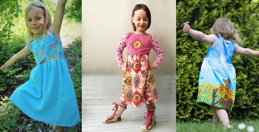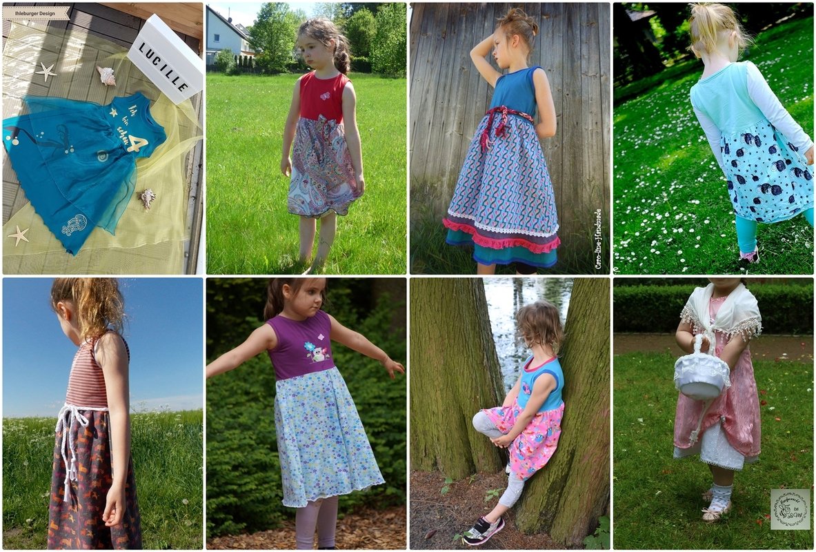Lucille ist ein süßes und schnell genähtes Sommerkleidchen für kleine Damen. Das Oberteil ist im Shirtstil gehalten und wird aus bequemen Jersey genäht. Der Rock kann sowohl einlagig, als auch zwei- oder sogar 3lagig genäht werden. Der Rock ist auf Webwaren ausgelegt. Du kannst deine Lucille also aus mehreren Lagen Chiffon nähen oder Stoffe wie z.B. Popeline, Georgette ,Tüll und Spitze miteinander kombinieren. Wenn`s mal ganz schnell gehen soll, dann kann der Rock auch aus Jersey genäht werden. Dann aber bitte maximal 2lagig, damit der Rock nicht zu schwer wird.
