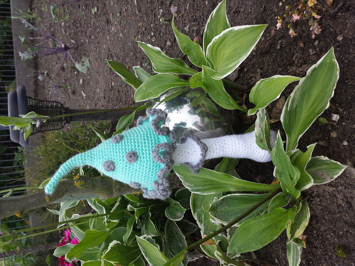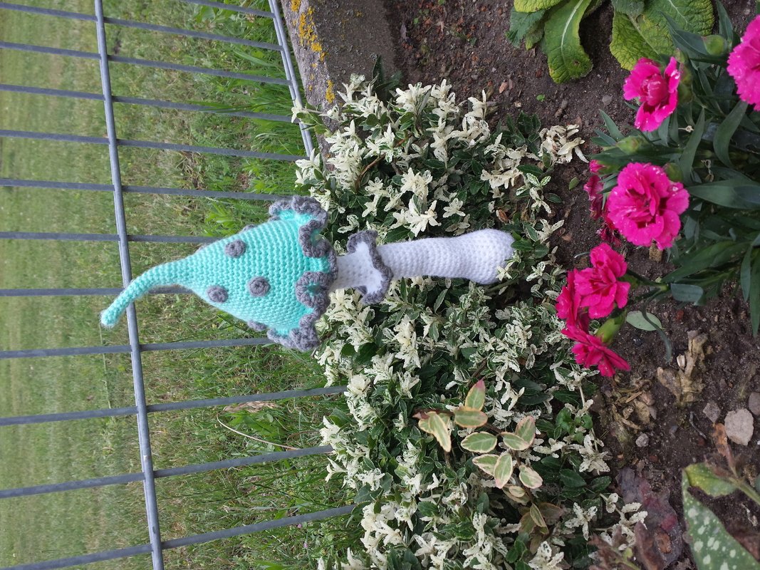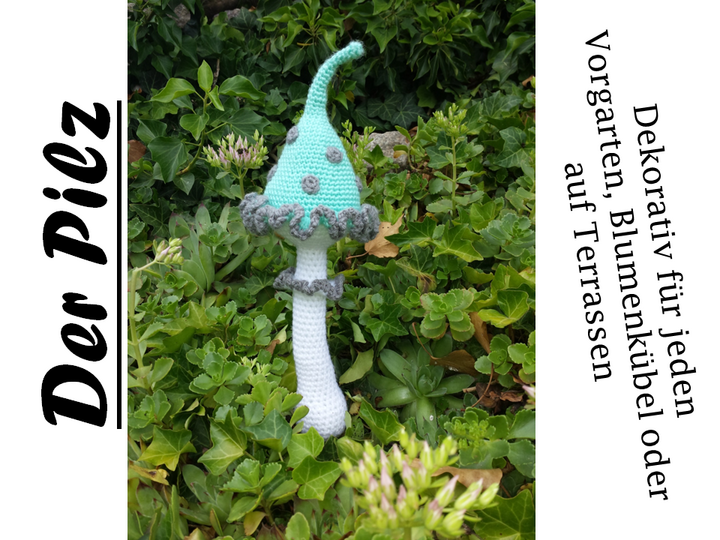 Der Pilz ist 32 cm groß je nach Häkelfestigkeit. Er ist sehr dekorativ im Blumenkübel, Terrasse und Beet