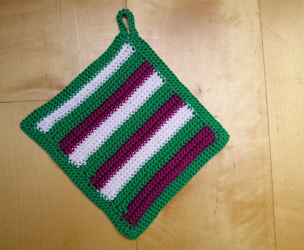 Der Motivtopflappen wird mehrfädig mit festen Maschen gehäkelt. Dabei hat man einen Arbeitsfaden und mehrere Ruhefäden. Während man mit dem Arbeitsfaden Maschen häkelt werden die Ruhefäden von den festen Maschen mit umhäkelt. Dadurch bilden die Ruhefäden auf den Rückseite keine langen Schlaufen und sind fast unsichtbar. Das ist nicht besonders schwierig und auch für Häkelanfängerinnen gut zu bewältigen. Die Anleitung enthält eine ausführliche textliche Beschreibung sowie eine Häkelschrift.