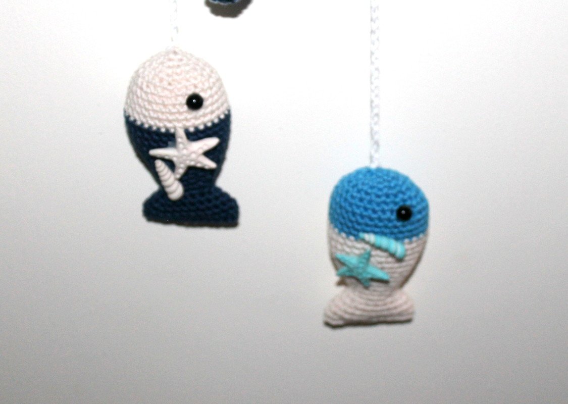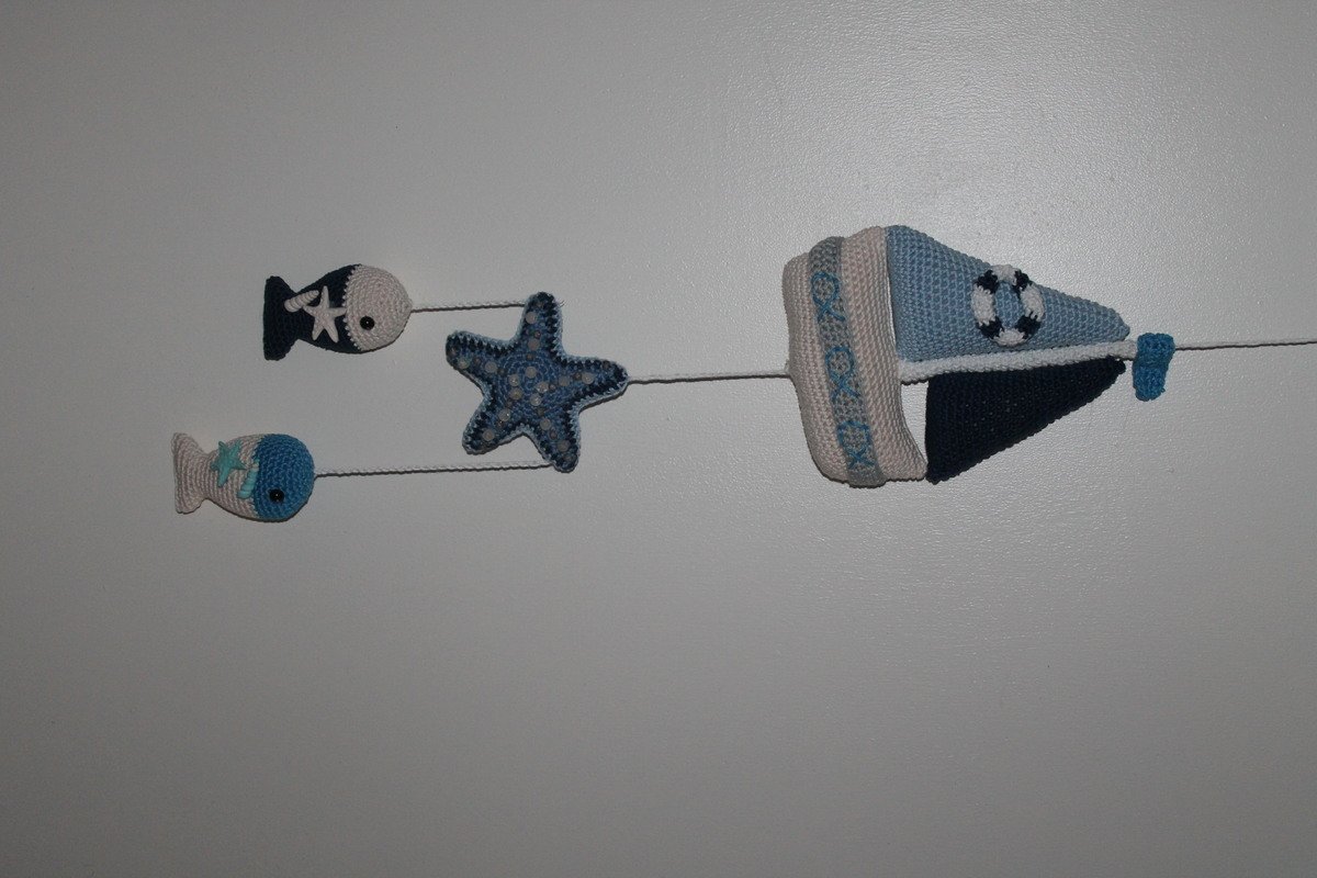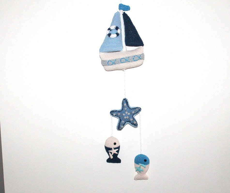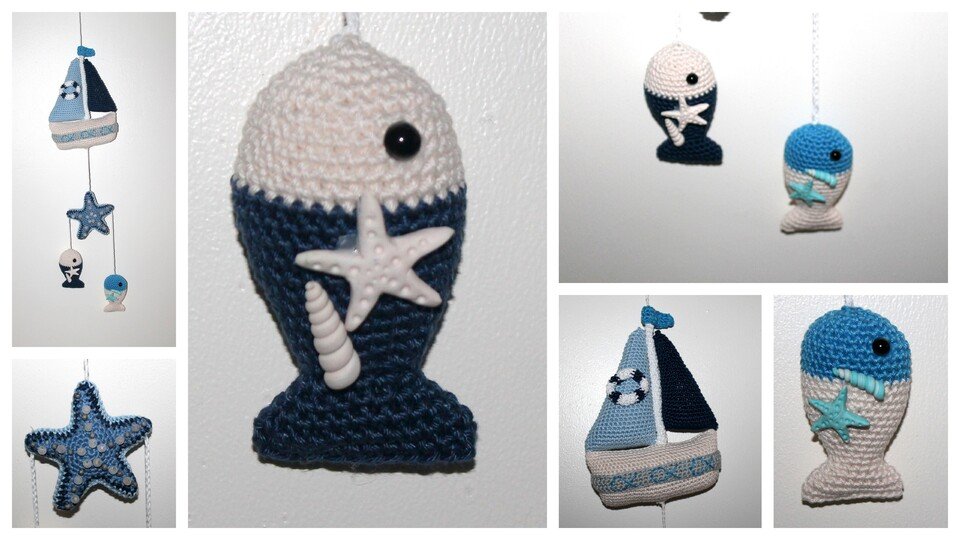 Diese schöne verspielte und maritime Deko kann wunderbar als Mobile, aber auch in einzel Teilen gehäkelt werden. Sie kann so also als Mobile fürs Kinderzimmer, oder auch als Badezimmer, oder Balkondeko gehäkelt werden.