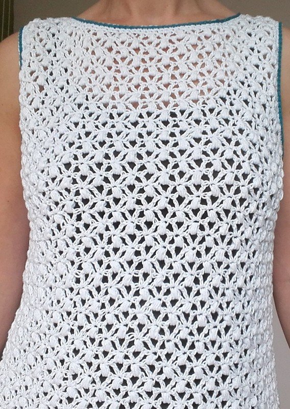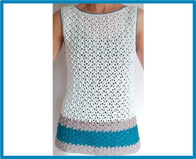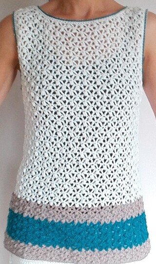 Das sommerliche Top kommt in einem hübschen Büschelgittermuster daher. Es wird von unten nach oben gehäkelt. Vorder- und Rückenteil werden identisch gehäkelt.