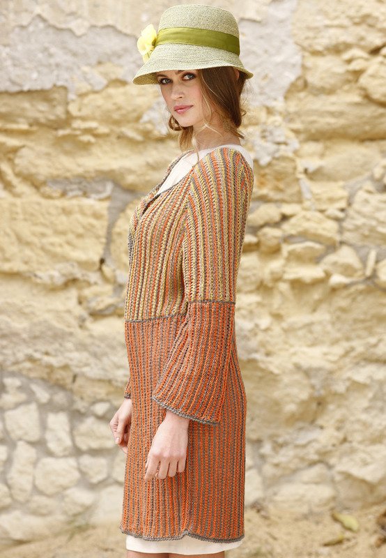 LANG YARNS „Lino“ (100% Leinen, LL ca 110 m/50 g): ca 250 (300) g Schlamm Fb 99, ca 250 (300) g Orange Fb 59, ca 100 g Stein Fb 39, ca 50 (100) g Messing Fb 11; addi-Stricknd Nr 4,5, addi-Häkelnd Nr 4,5.
