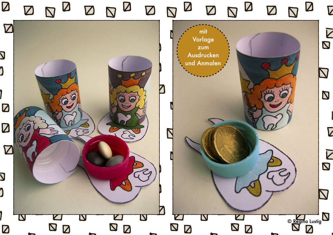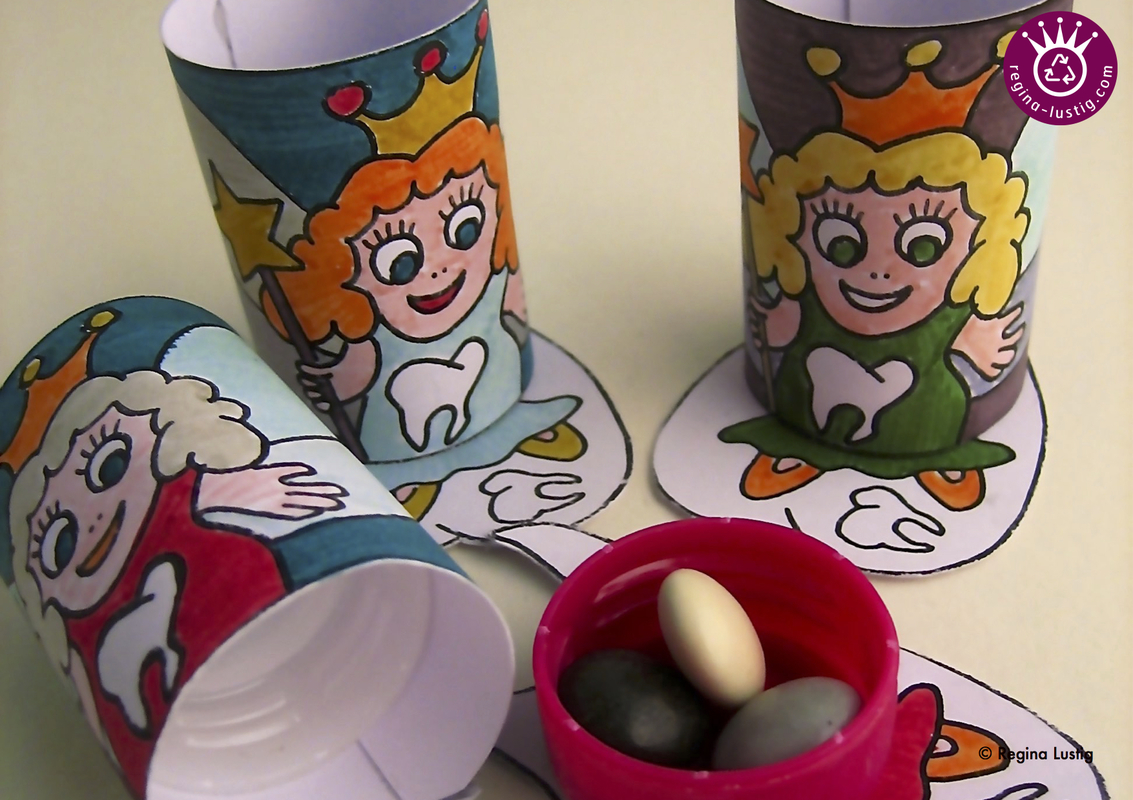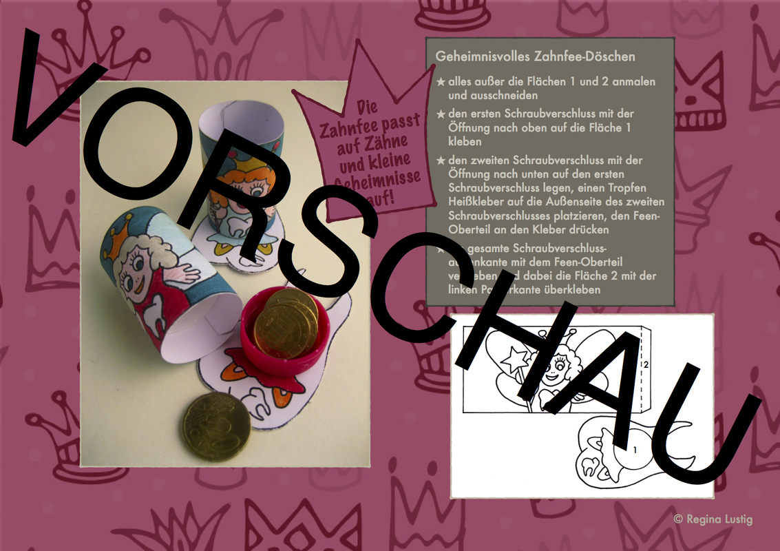 Dennoch fragen mich LehrerInnen und Eltern oft nach Vorlagen zum Weiterbasteln. Deshalb habe ich die Anleitung "Basteln mit PET-Verschlüssen und Papier" gestaltet, die 10 lustige Modelle beinhaltet. "Zahnfee-Döschen" ist eines davon. Der gesamte preisreduzierte Sammelband und alle anderen 9 Anleitungen einzeln sind ebenfalls bei Crazy Patterns erhältlich.