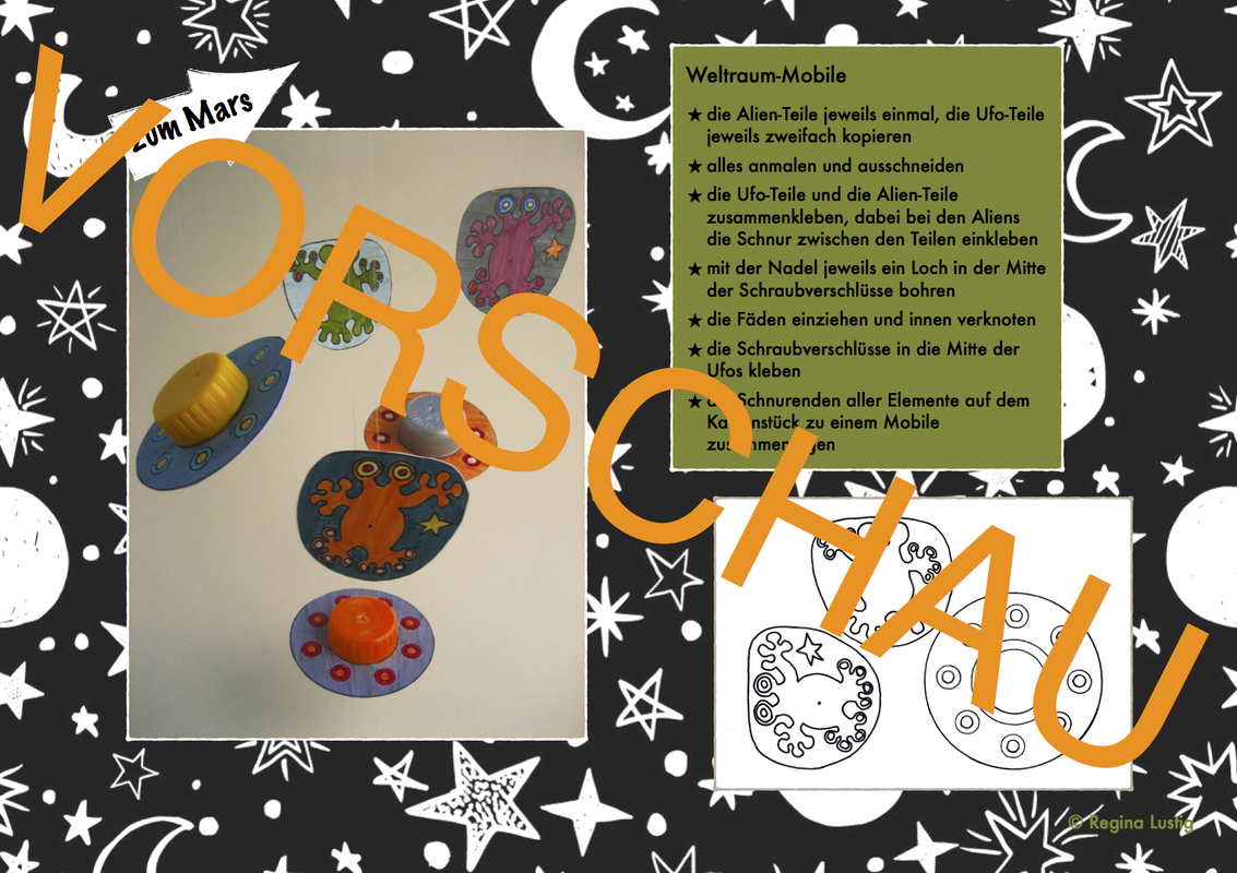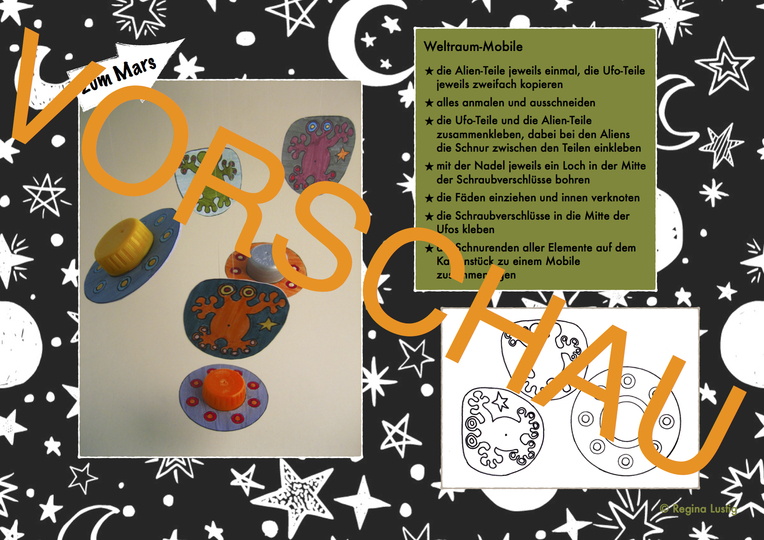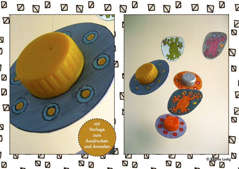 Dennoch fragen mich LehrerInnen und Eltern oft nach Vorlagen zum Weiterbasteln. Deshalb habe ich die Anleitung "Basteln mit PET-Verschlüssen und Papier" gestaltet, die 10 lustige Modelle beinhaltet. "Weltraum-Mobile" ist eines davon. Der gesamte preisreduzierte Sammelband und alle anderen 9 Anleitungen einzeln sind ebenfalls bei Crazy Patterns erhältlich.