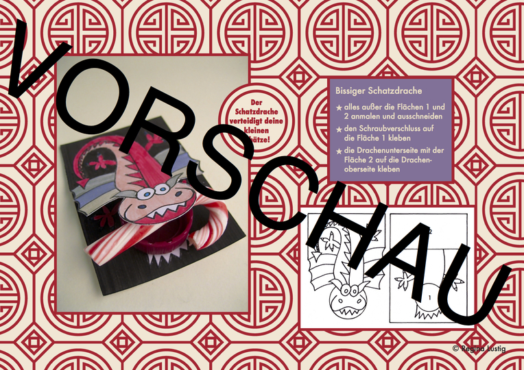 Dennoch fragen mich LehrerInnen und Eltern oft nach Vorlagen zum Weiterbasteln. Deshalb habe ich die Anleitung "Basteln mit PET-Verschlüssen und Papier" gestaltet, die 10 lustige Modelle beinhaltet. "Bissiger Schatzdrache" ist eines davon. Der gesamte preisreduzierte Sammelband und alle anderen 9 Anleitungen einzeln sind ebenfalls bei Crazy Patterns erhältlich.