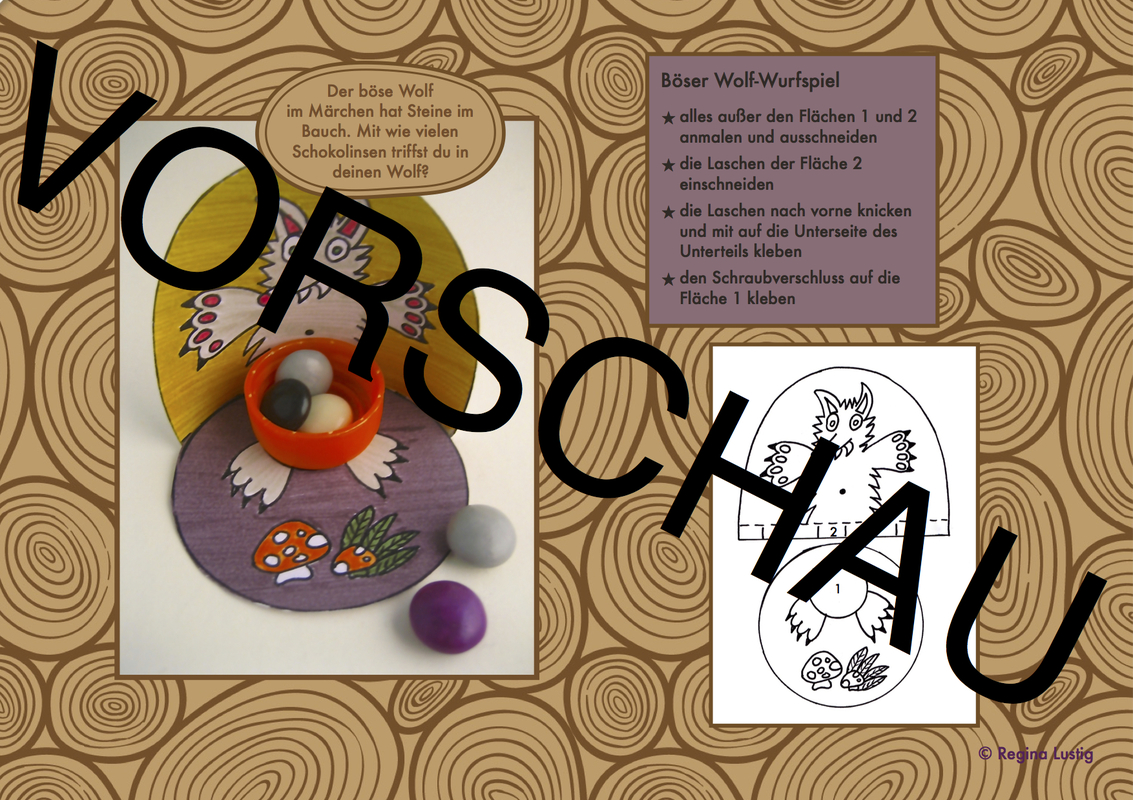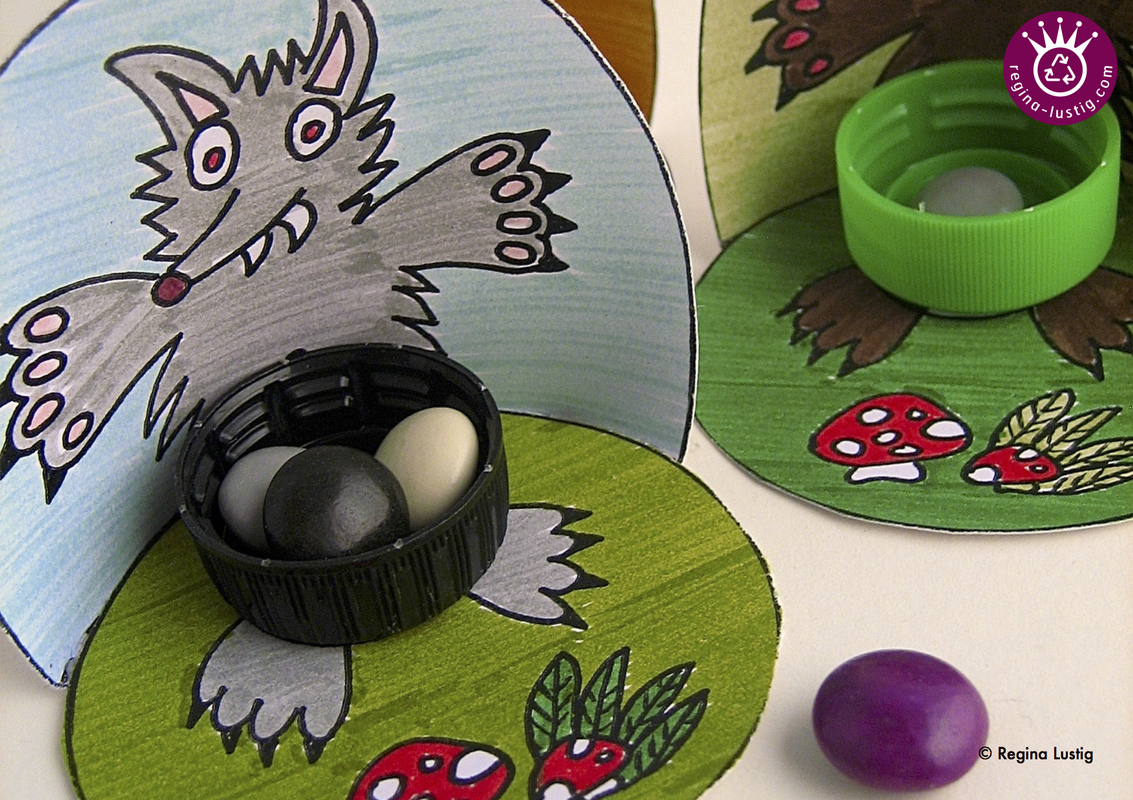 Dennoch fragen mich LehrerInnen und Eltern oft nach Vorlagen zum Weiterbasteln. Deshalb habe ich die Anleitung "Basteln mit PET-Verschlüssen und Papier" gestaltet, die 10 lustige Modelle beinhaltet. "Böser Wolf-Wurfspiel" ist eines davon. Der gesamte preisreduzierte Sammelband und alle anderen 9 Anleitungen einzeln sind ebenfalls bei Crazy Patterns erhältlich.
