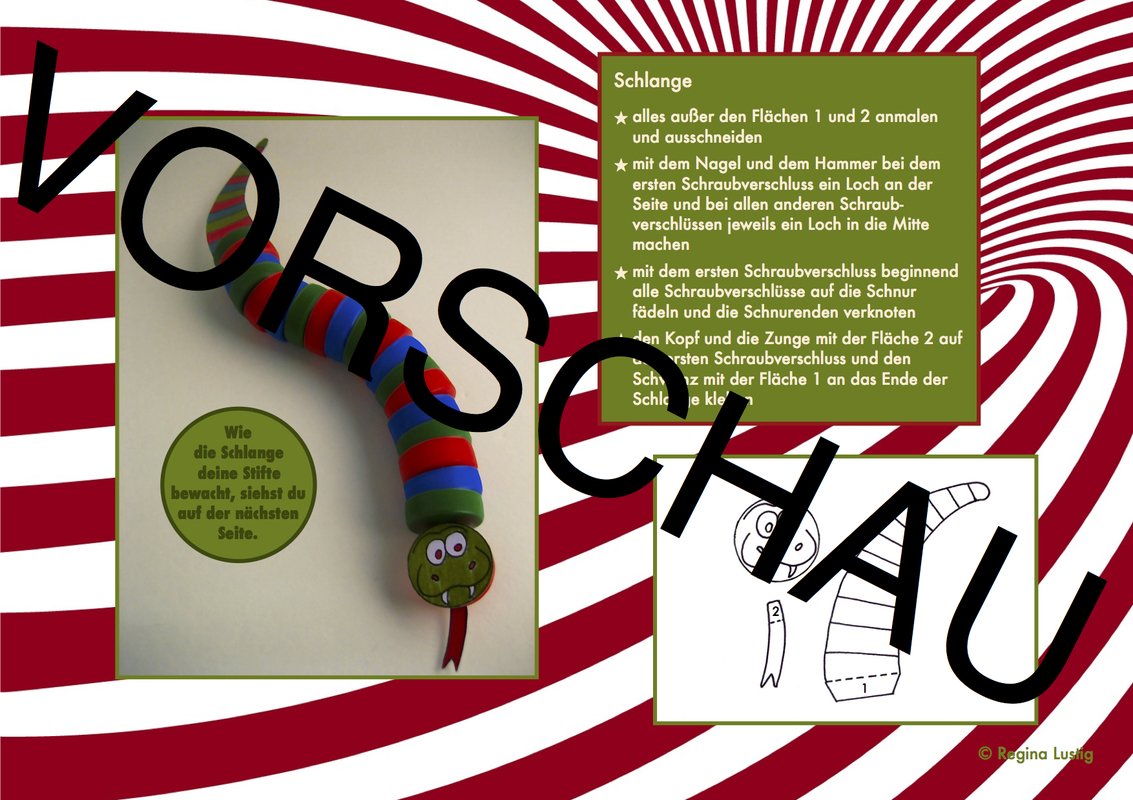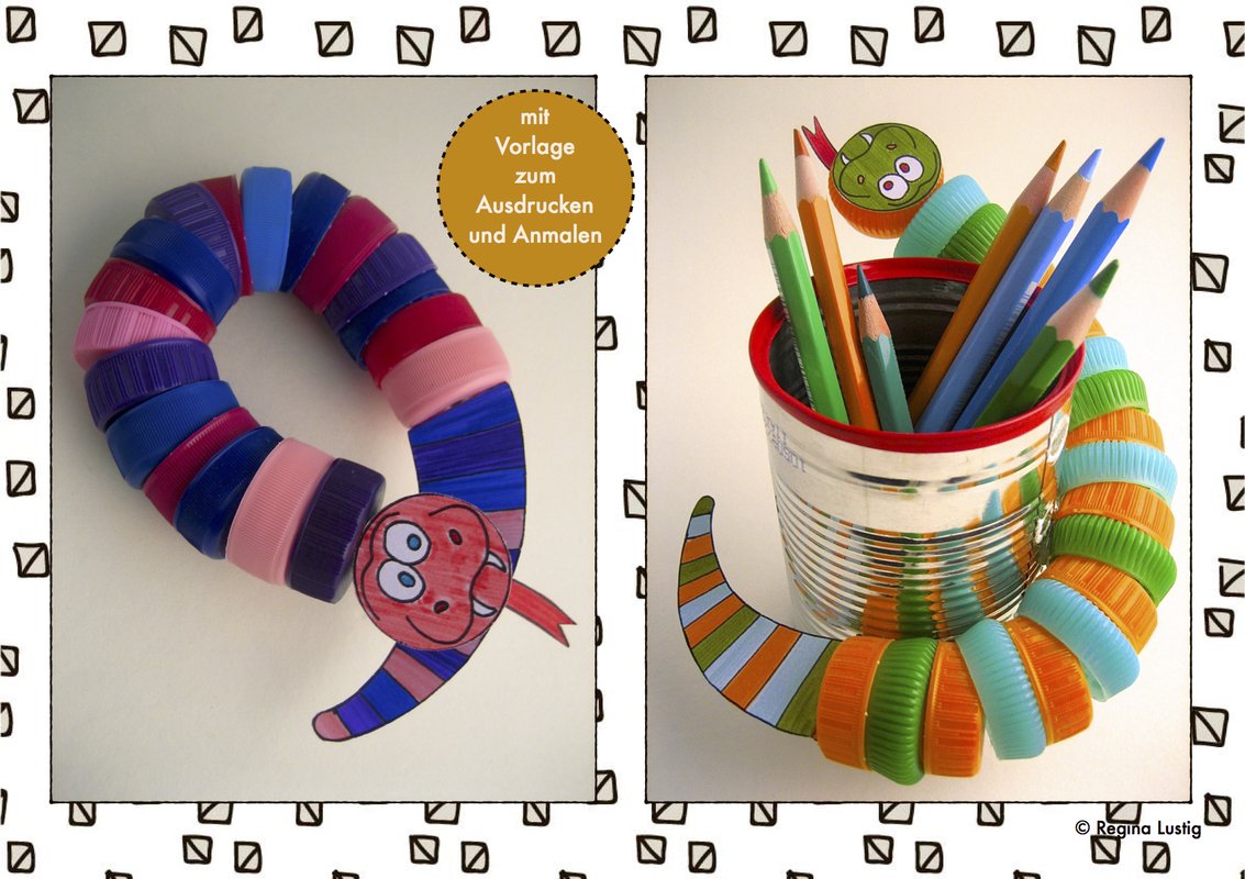 Dennoch fragen mich LehrerInnen und Eltern oft nach Vorlagen zum Weiterbasteln. Deshalb habe ich die Anleitung "Basteln mit PET-Verschlüssen und Papier" gestaltet, die 10 lustige Modelle beinhaltet. "Schlange" ist eines davon. Der gesamte preisreduzierte Sammelband und alle anderen 9 Anleitungen einzeln sind ebenfalls bei Crazy Patterns erhältlich.