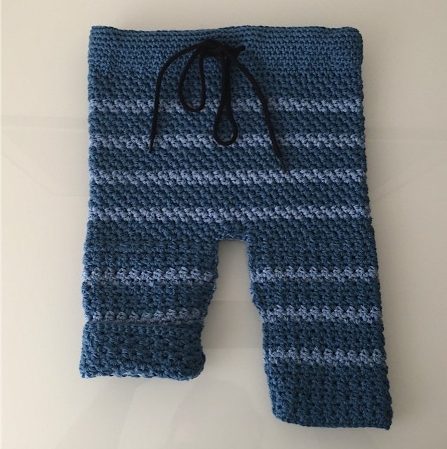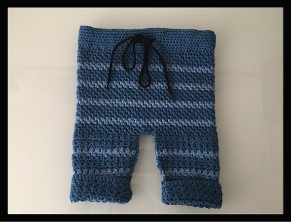 Die Hose wird zu Beginn in Reihen und später in Runden gehäkelt und mit einem Tunnelzug versehen.