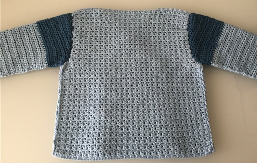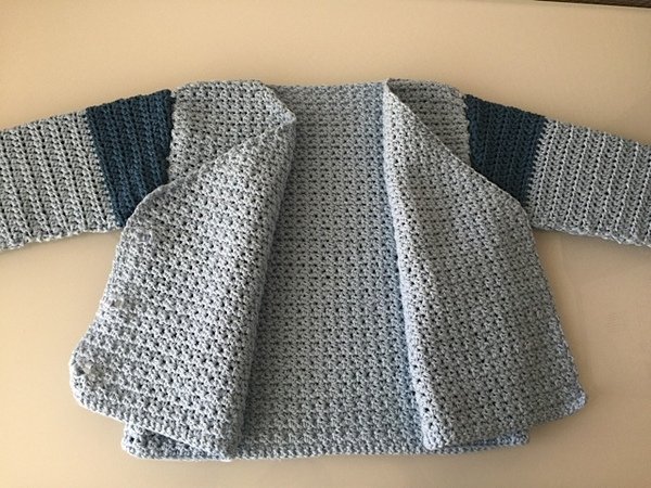 Die Jacke besteht aus Rückenteil, 2 Vorderteilen und Arme. Hier wird alles in Reihen gehäkelt und später zusammengenäht.