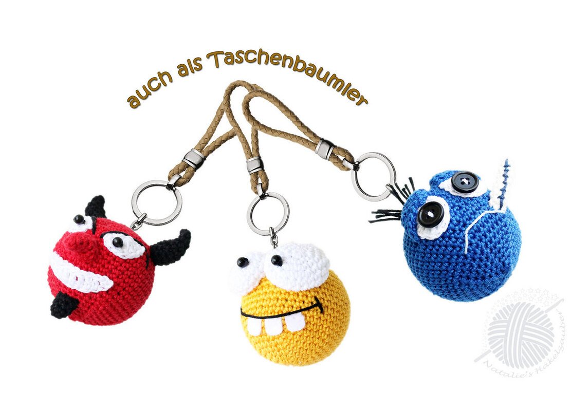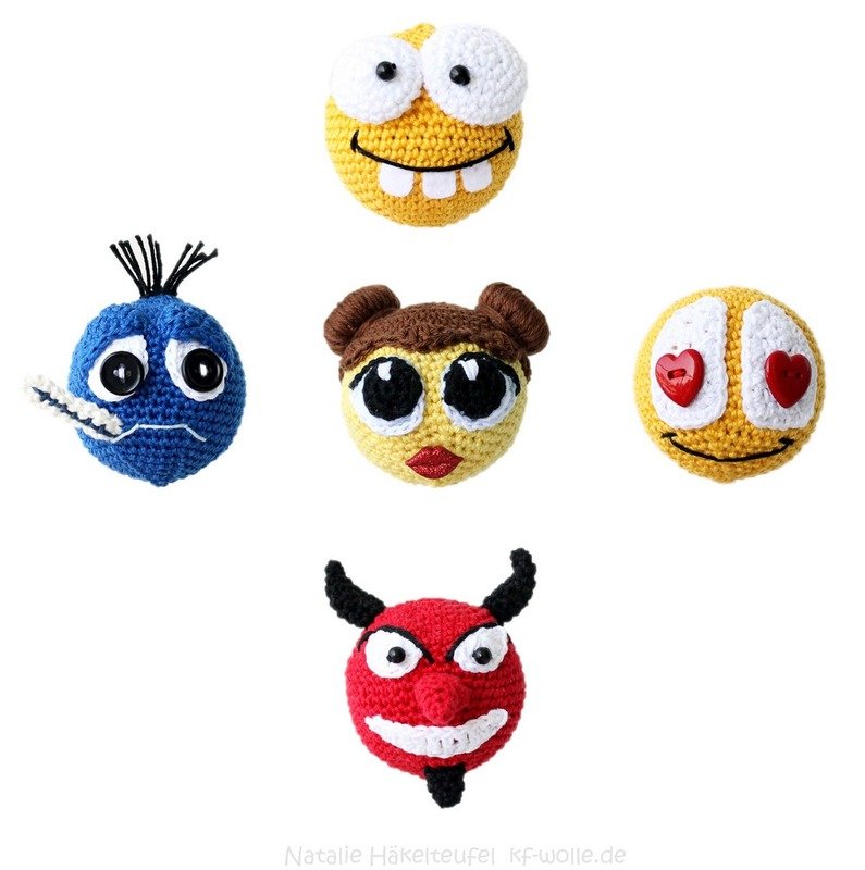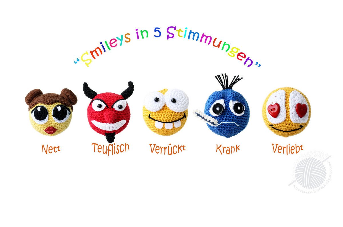 Die umfangreiche, reichlich bebilderte PDF-Häkelanleitung zum häkeln von 5 Smileys als Taschenanhänger, Dekoration oder kleine Mitbringsel. Als Taschenanhänger können Sie die Smileys ausgehend von Ihrer Stimmung austauschen.