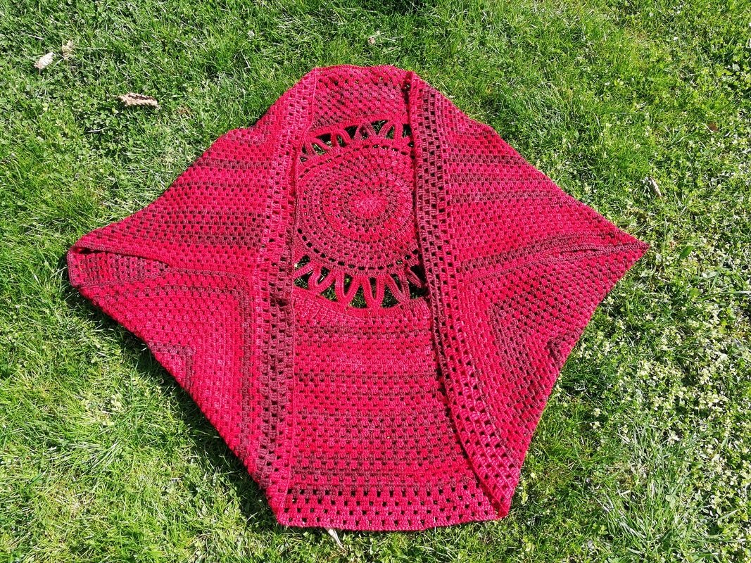 Zuerst symbolisiert ein Kreis die Sonne. Dann wechselt der Seelenwärmer zu einer quadratischen Form. Zuletzt hängt man ganz einfach ein paar Häkelreihen dran, damit die Jacke rechteckig wird und auch für größere Oberweiten passt.