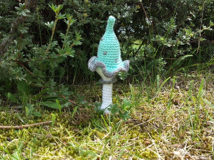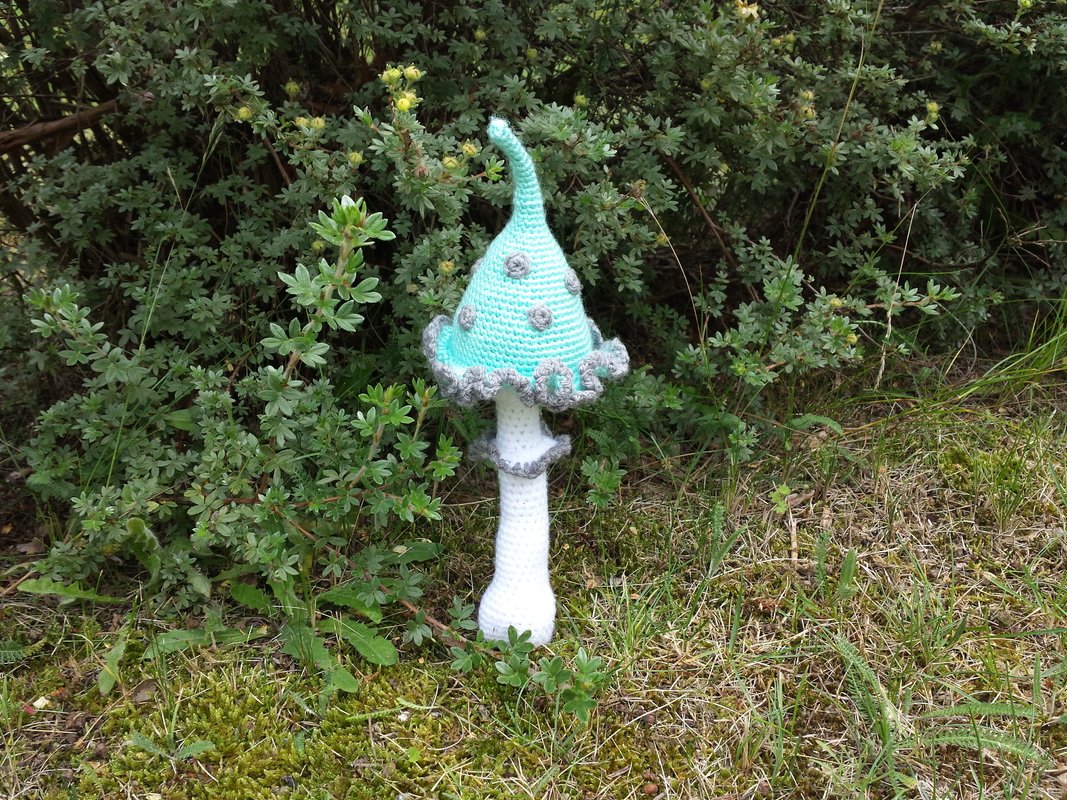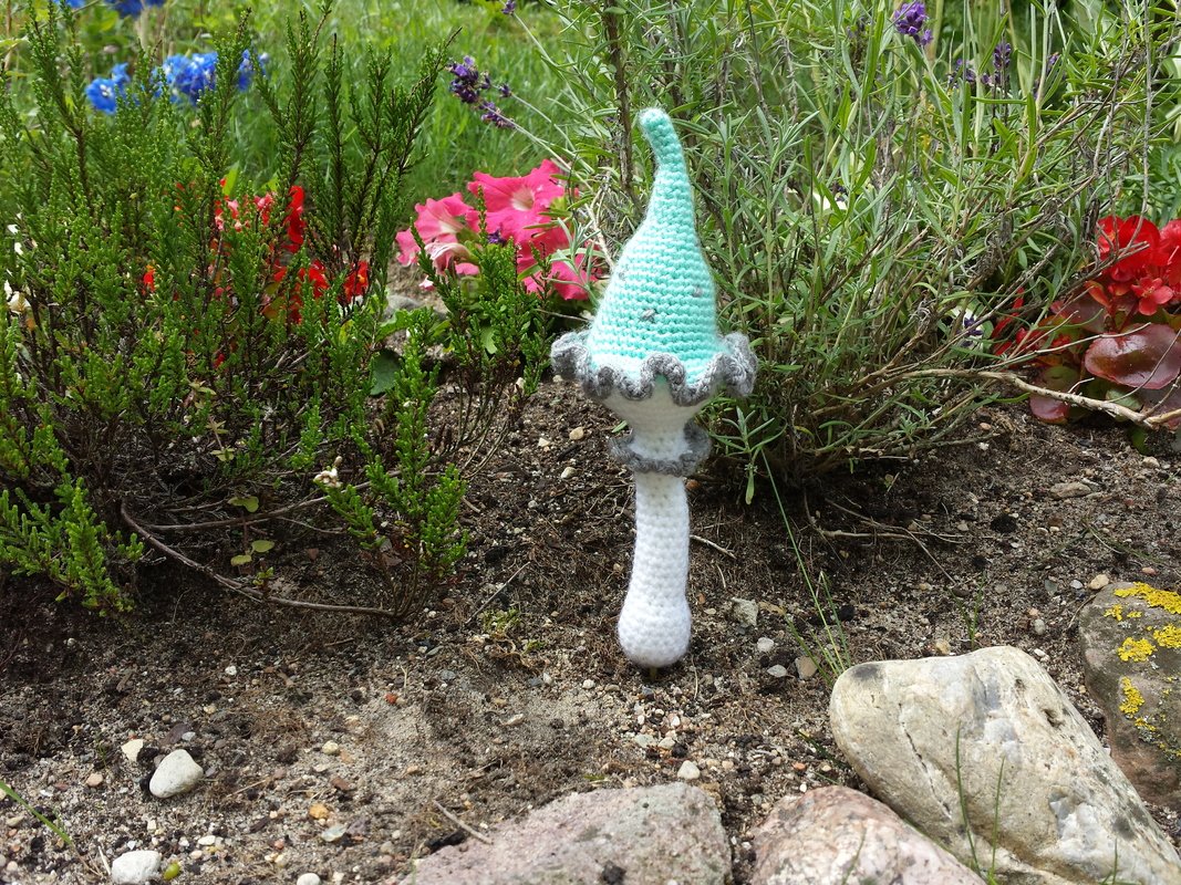 Die Pilze sind 32, 24 und 17 cm groß je nach Häkelfestigkeit. Sie sind sehr dekorativ im Blumenkübel und -töpfe, auf Terrasse und Beet