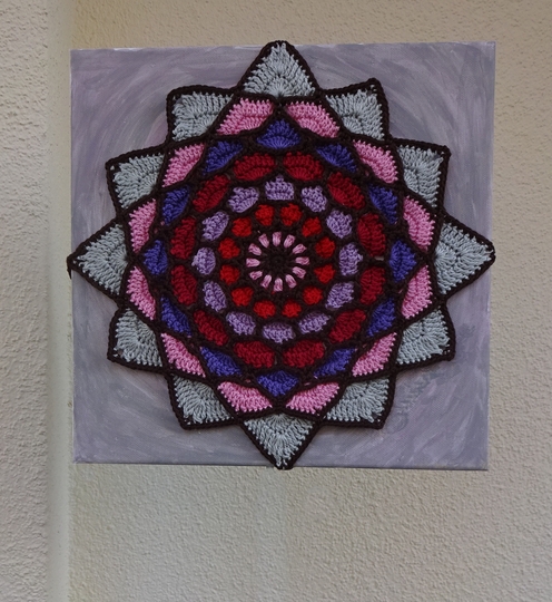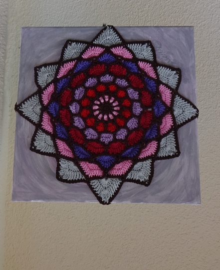 Hier ist die Anleitung zu meinem bisher größten Mandala auf Leinwand. Ich habe es in Rot, Rosa und Grau gehalten. Die Umrandung der Farbflächen sind Schoko- braun. Ich nenne es:
