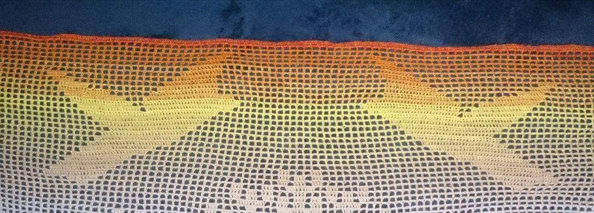 Gehäkelt wird von unten nach oben. Benötigt werden Grundkenntnisse beim Häkeln von Luftmaschen, Stäbchen und Doppelstäbchen. Das Motivtuch wurde mit einem dreifädigen Farbverlaufsgarn gehäkelt. Verwendet wurden ca. 800 Meter. Damit hat das Tuch eine Größe von etwa 190x80 cm.